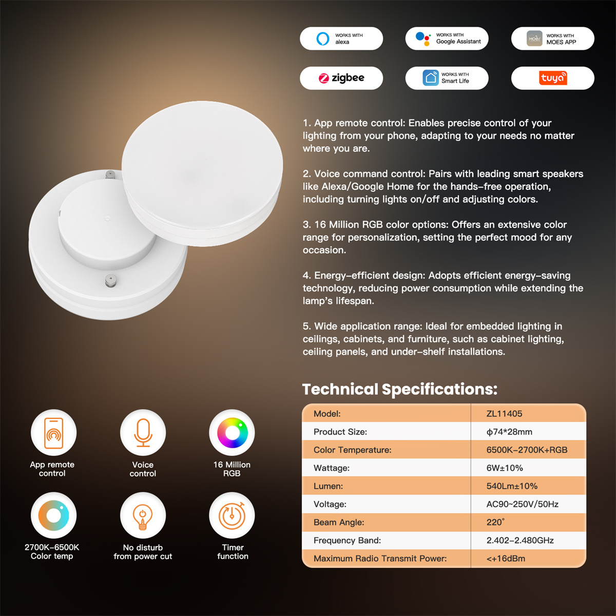 1. App Remote Control: Adjust brightness, color, and schedules conveniently through compatible apps like MOES, Smart Life, or Tuya.