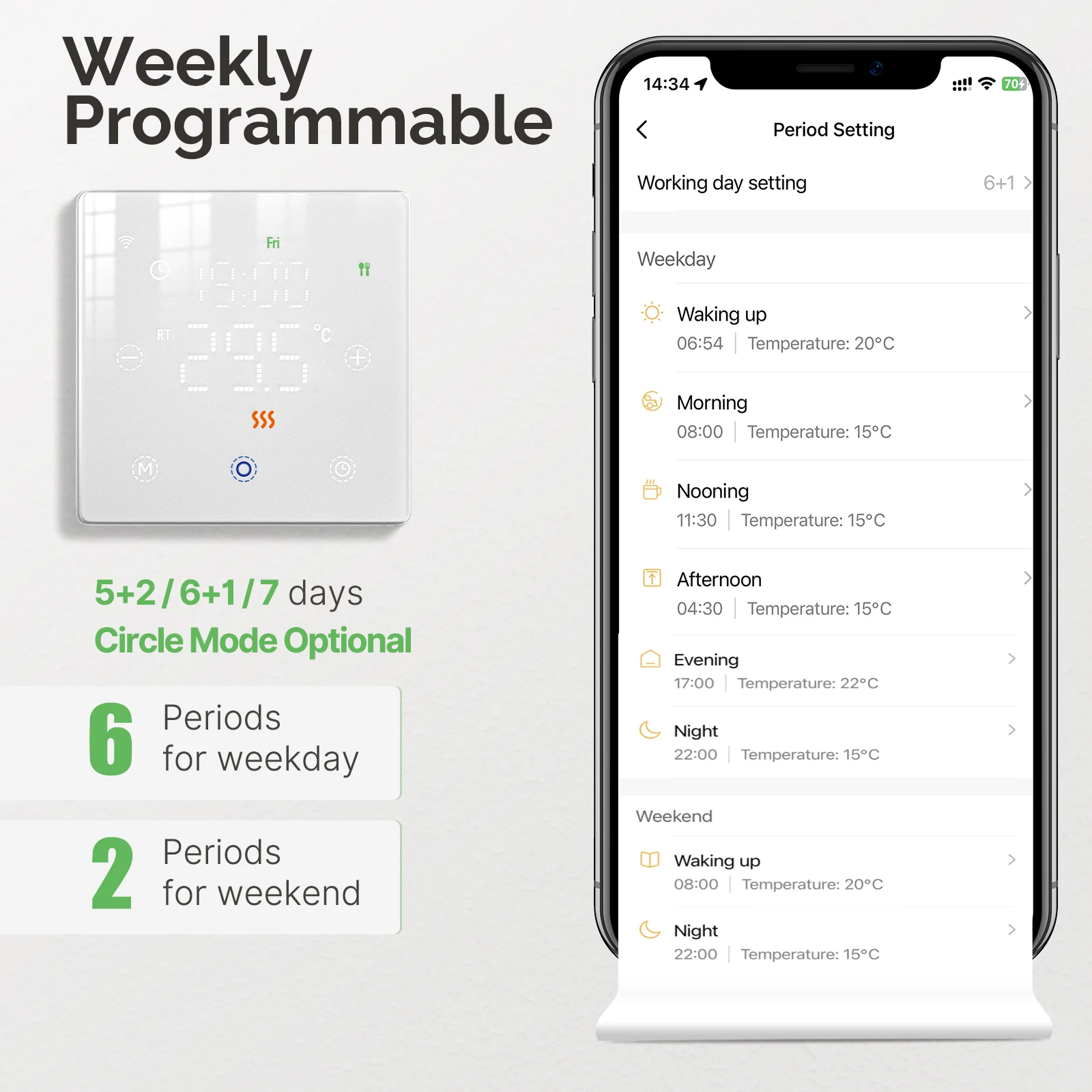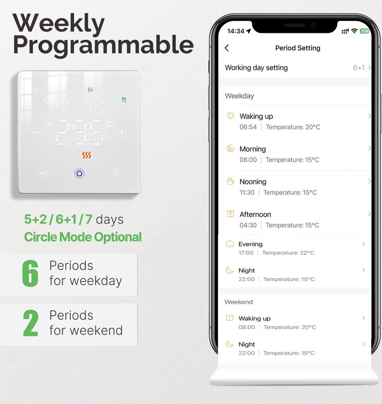 3. Weekly Programmable: Configurable 5+2, 6+1, 7 days programming with up to 6 periods for weekdays and 2 for weekends.