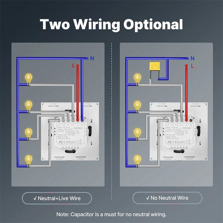 5. Optional Neutral Wire: Supports both single-live and neutral-live wiring, making it suitable for older houses without reserved neutral wires, as well as more stable neutral-live wiring setups.