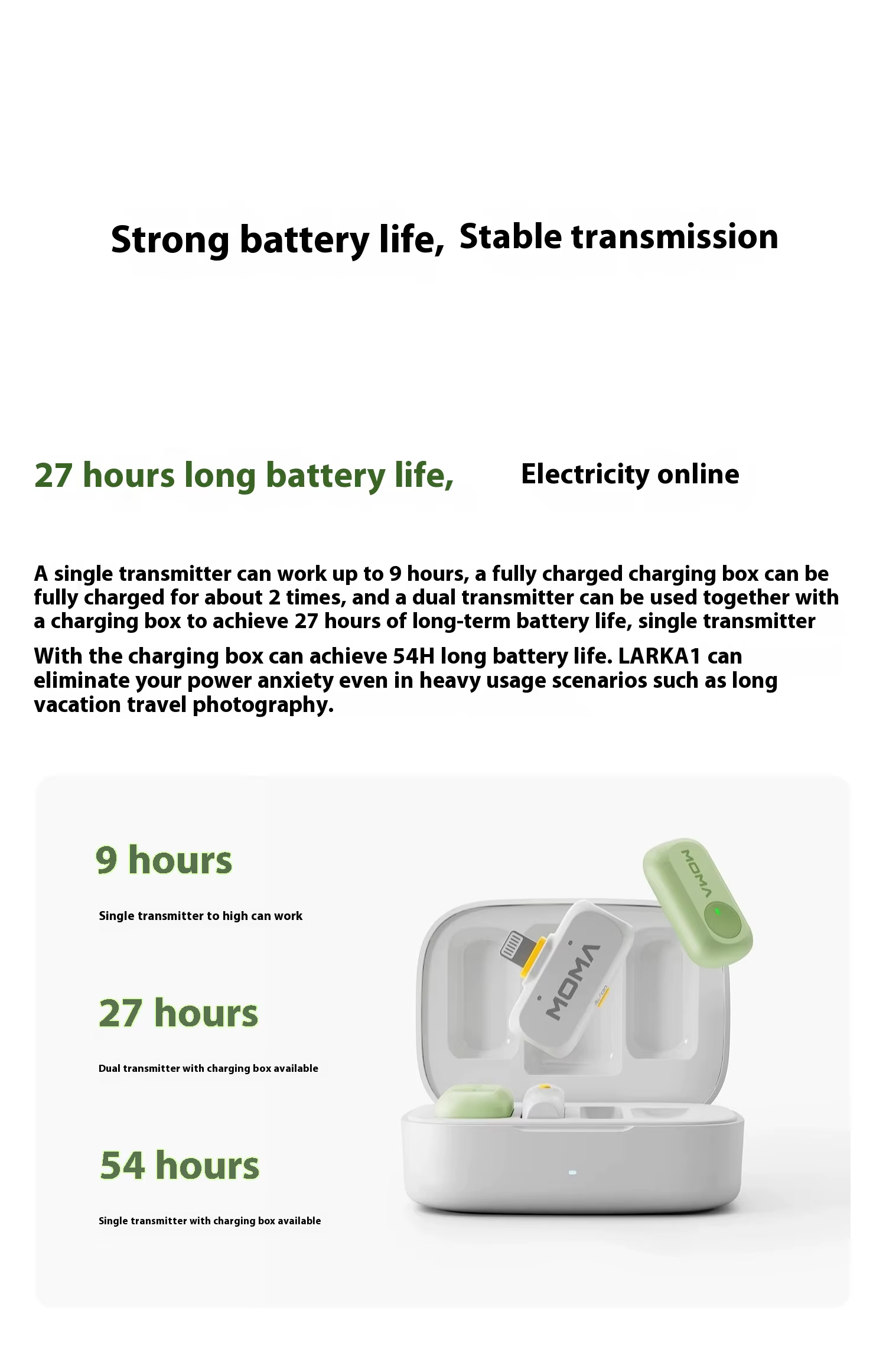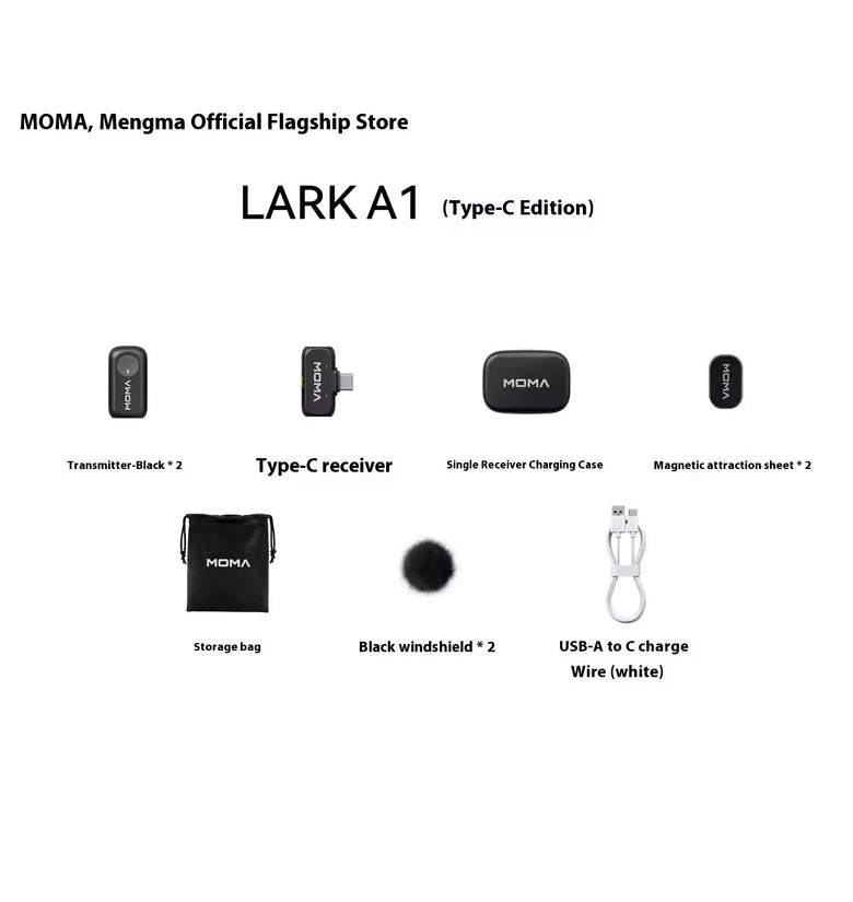 • MOMA LARK A1 Wireless Lavalier Microphone 48kHz/24bit HD Noise Reduction 200m Transmission 3-Level Adjustable EQ 27H Battery Live Streaming Mic
