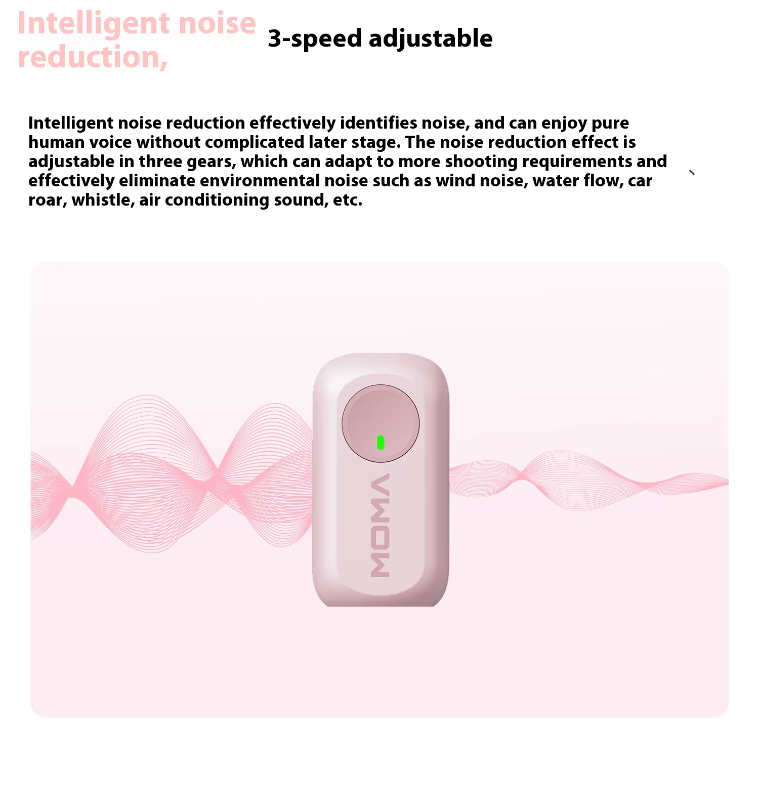 3. Intelligent Noise Reduction: Three-level adjustable noise reduction to remove environmental distractions such as wind, water noises, or traffic sounds.