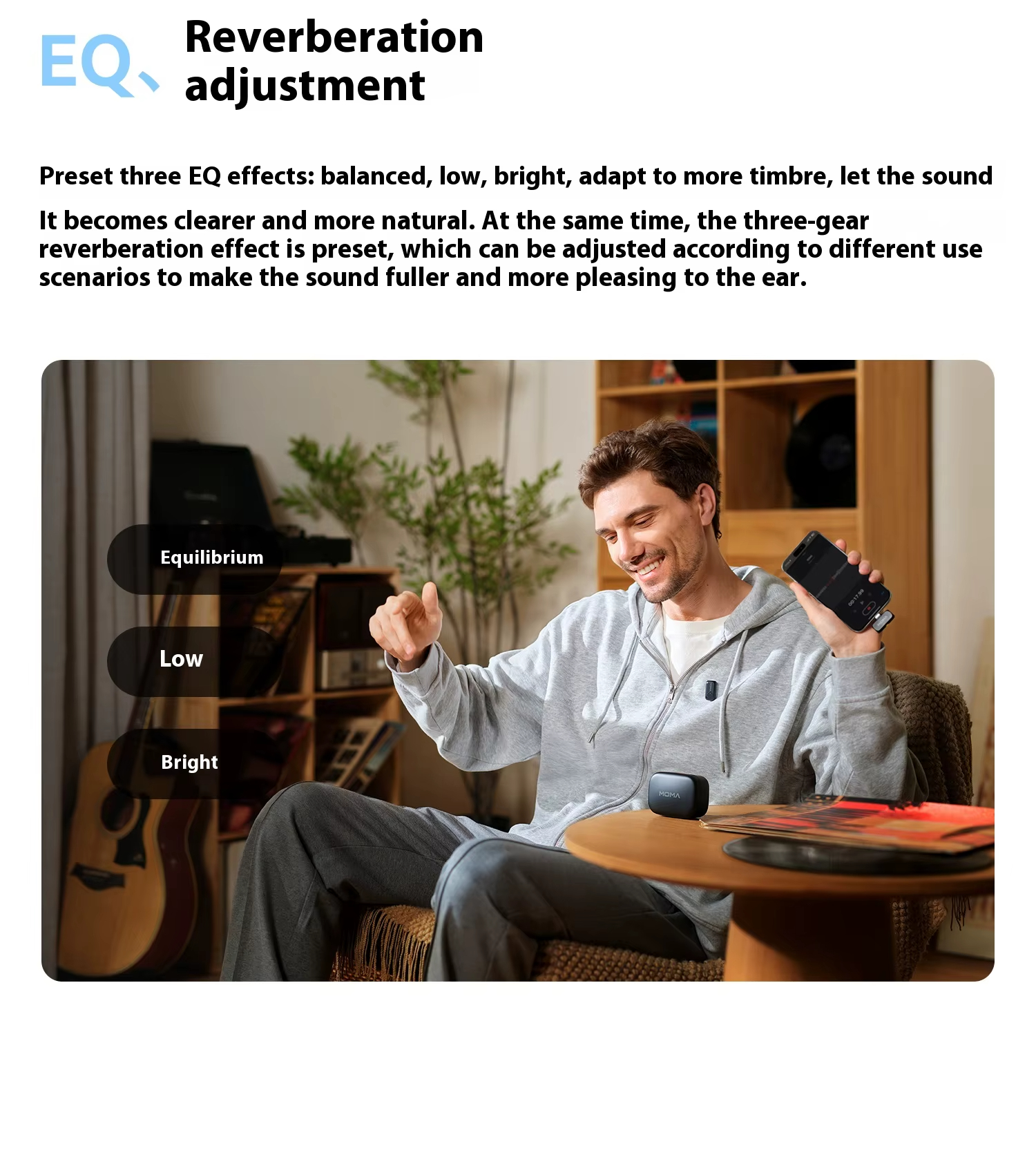 5. Advanced EQ Controls: Built-in EQ settings with three modes (balanced, bright, and bass-optimized) to suit different recording scenarios.