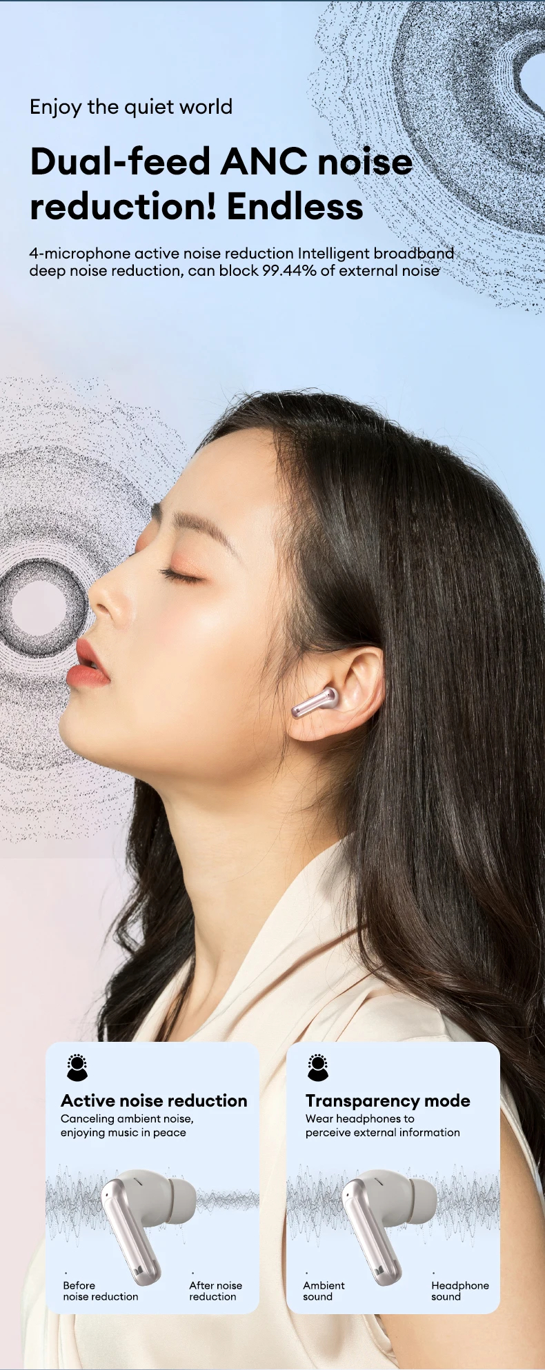 Enjoy crystal-clear conversations and immersive sound with four built-in microphones and dual-feed active noise-canceling technology that blocks 99.44% of external noise.