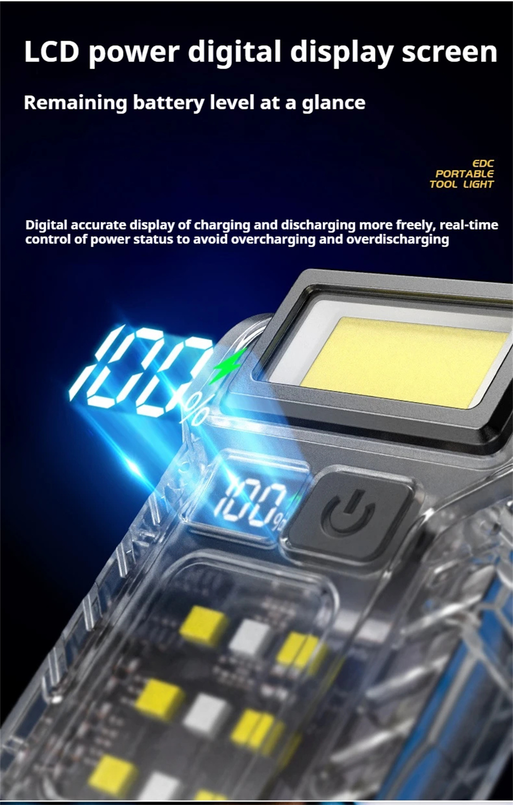 3.Power Display Feature: Equipped with a power display, the portable torch lamp lets you monitor remaining battery life conveniently, ensuring you're never caught off guard by a sudden power outage.