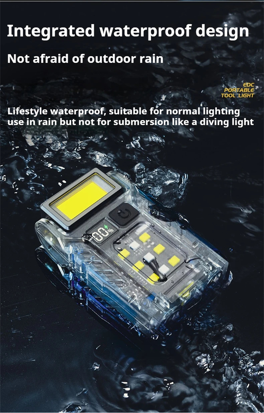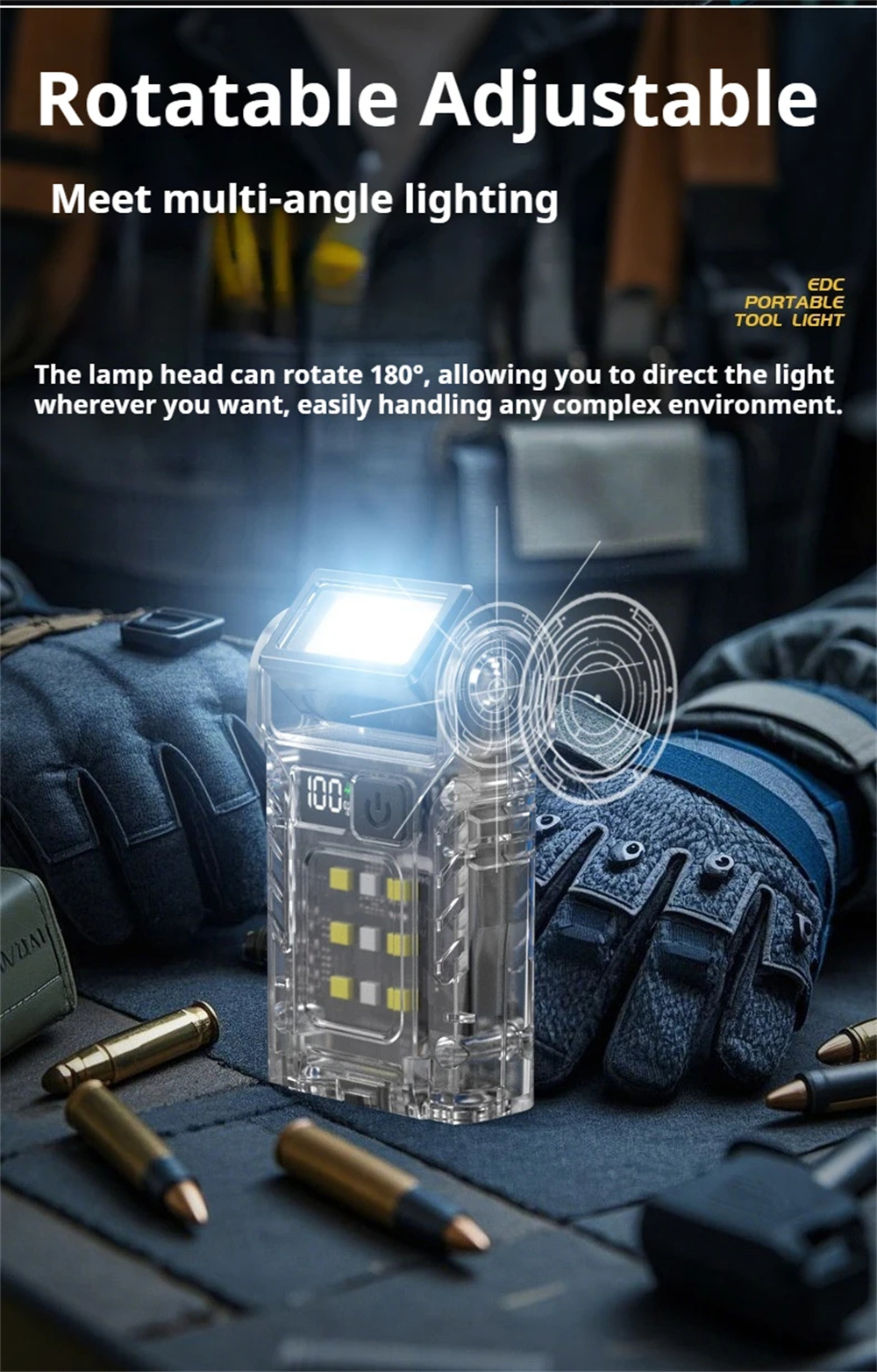 1.Rotatable Head Design: With a rotatable head, the outdoor mini flashlight allows you to adjust the angle of light effortlessly. Whether reading, repairing items, or exploring dark areas, this feature provides versatile illumination situations.