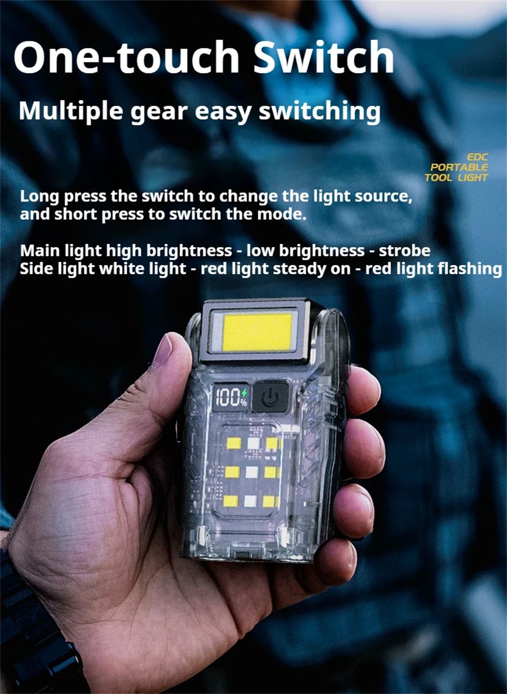 Gear: Press the switch to switch the main light source to strong light-weak light-flash Side light white light-red light always on-red light flashing