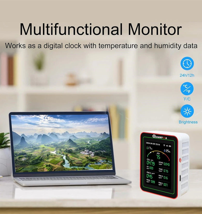 • MUSTOOL 15-in-1 Air Quality Monitor Wifi Tuya App 15-in-1 Smart Tester With stand CO2 CO TVOC HCHO PM2.5 PM1.0 PM10 AQI Battery Powered Real-Time Display for Home Office