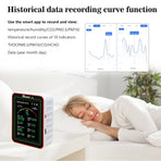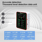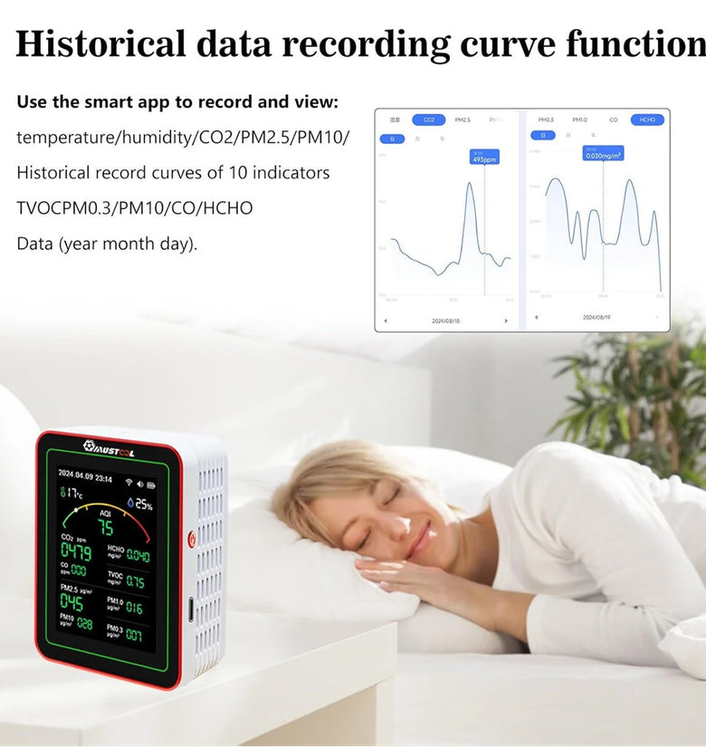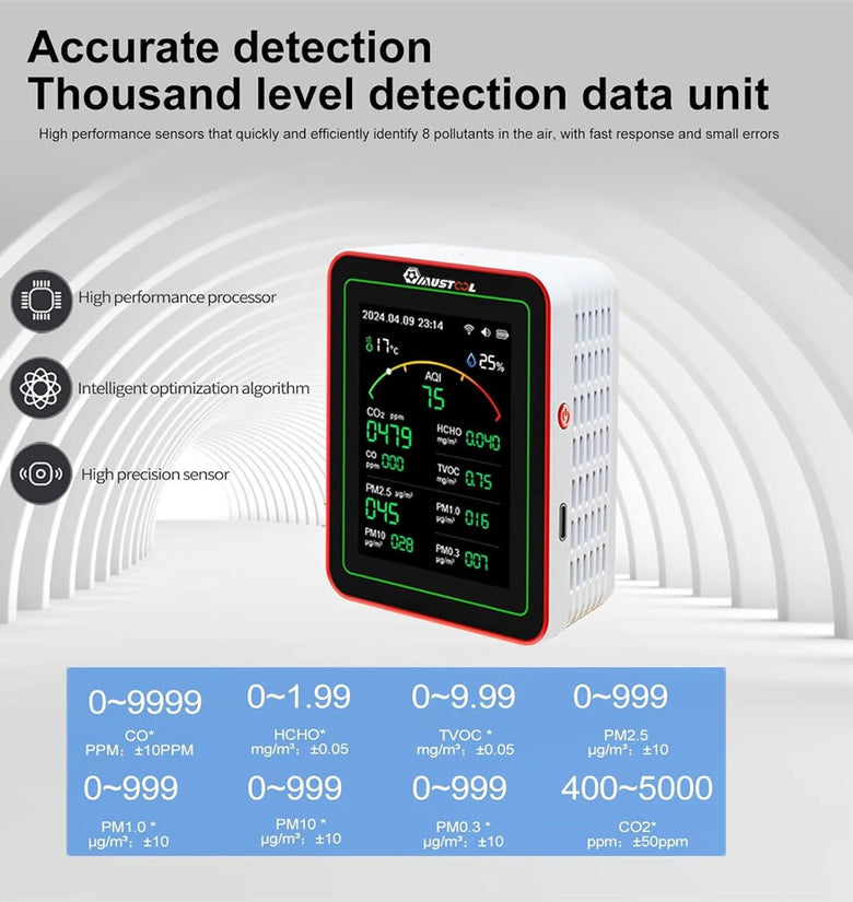 High Sensitivity Sensors: Equipped with highly sensitive sensors, it provides precise readings for CO2 (1PPM), CO (1PPM), TVOC (0.01mg/m³), HCHO (0.01mg/m³), and PM (1µg/m³).