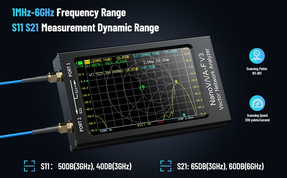 S11 Dynamic Range: 50dB (3GHz), 40dB (6GHz)