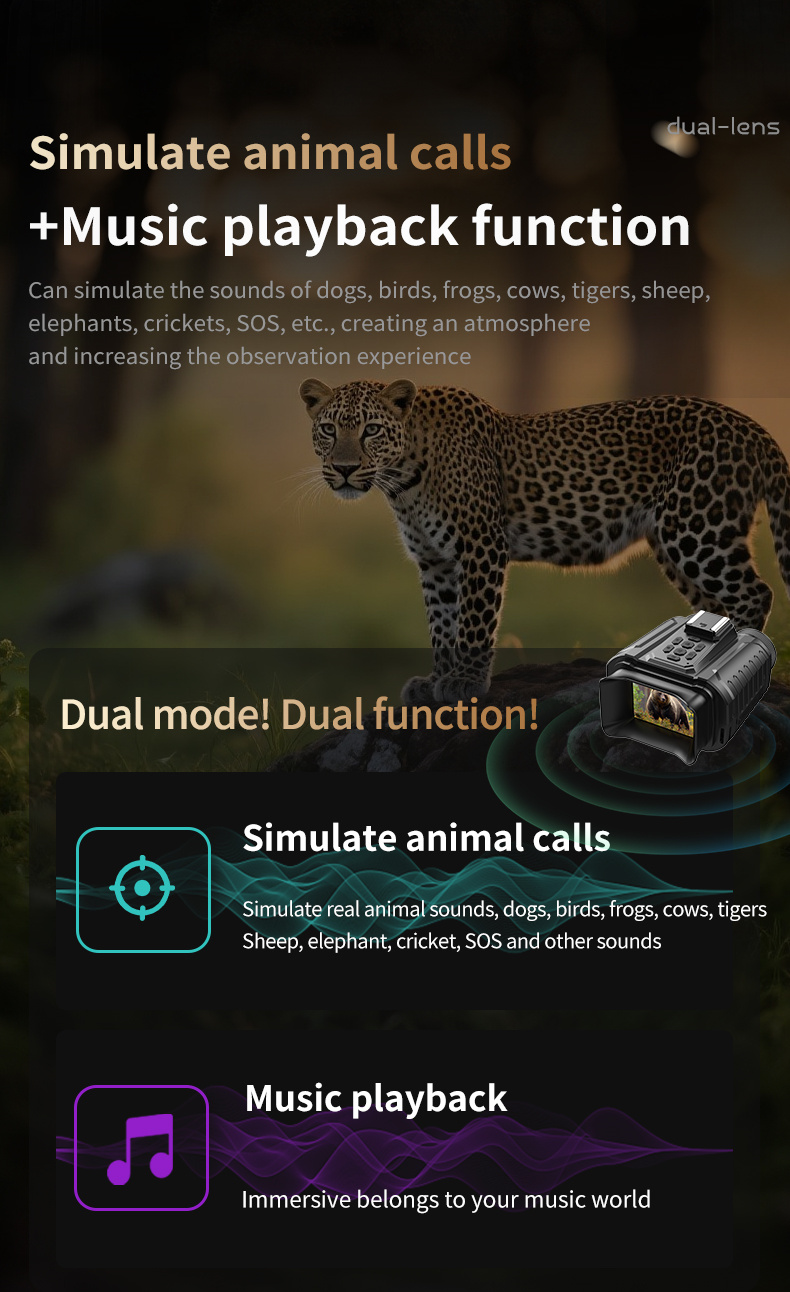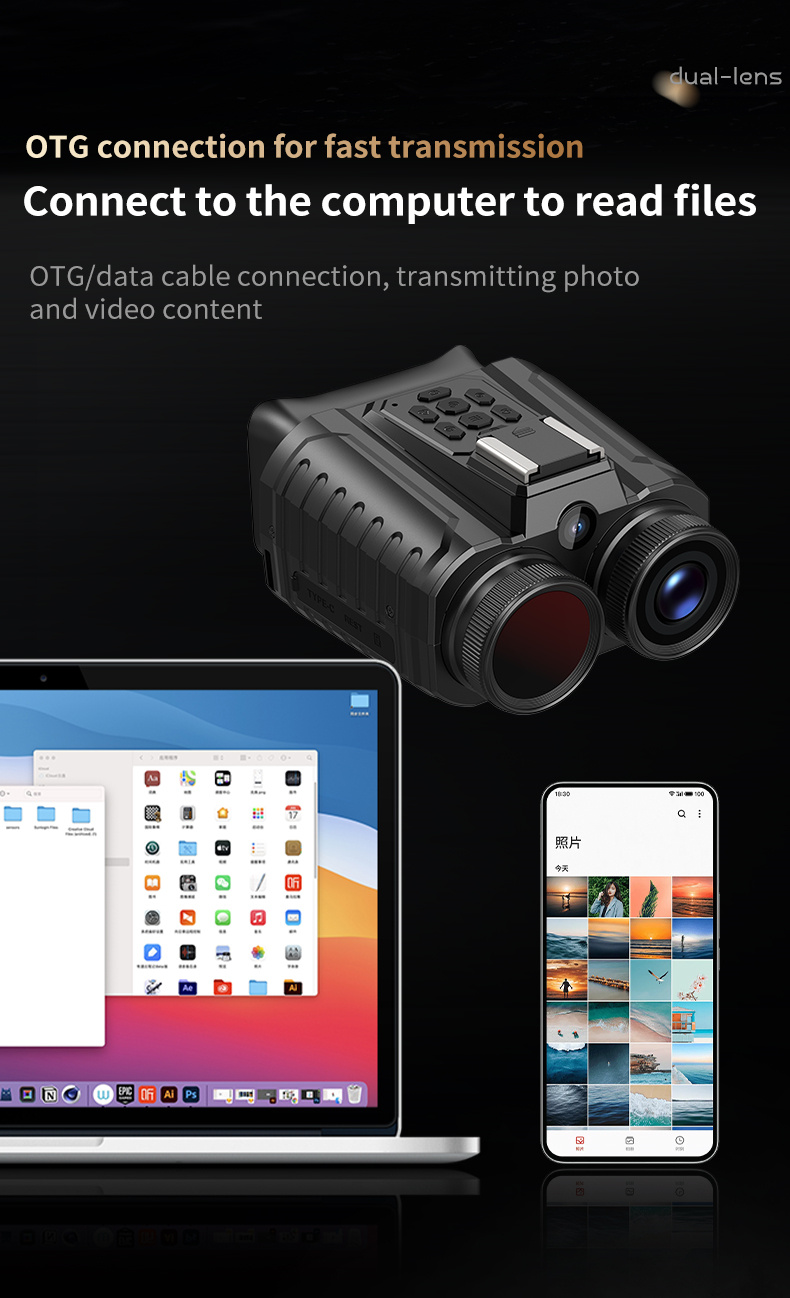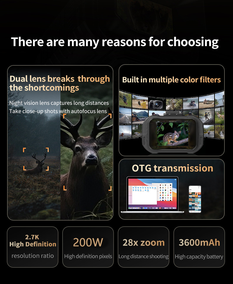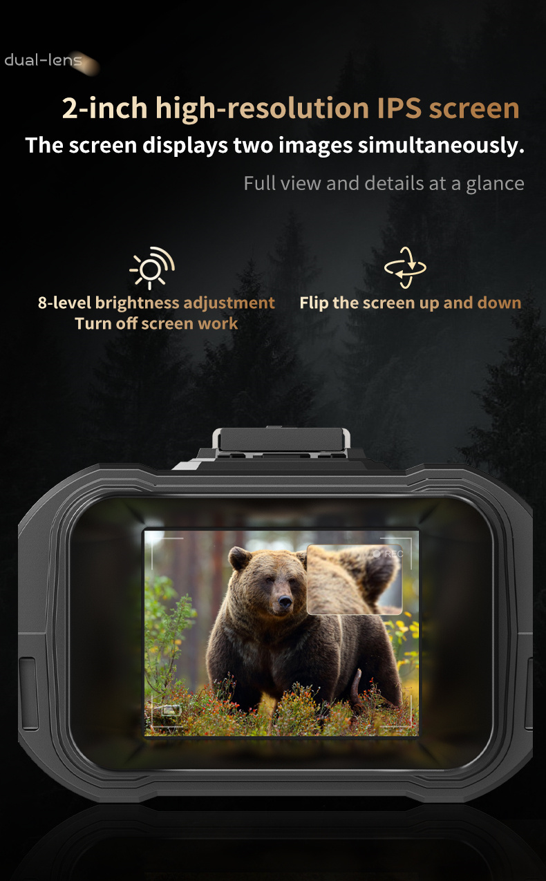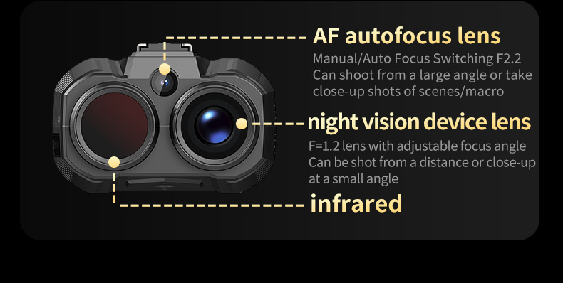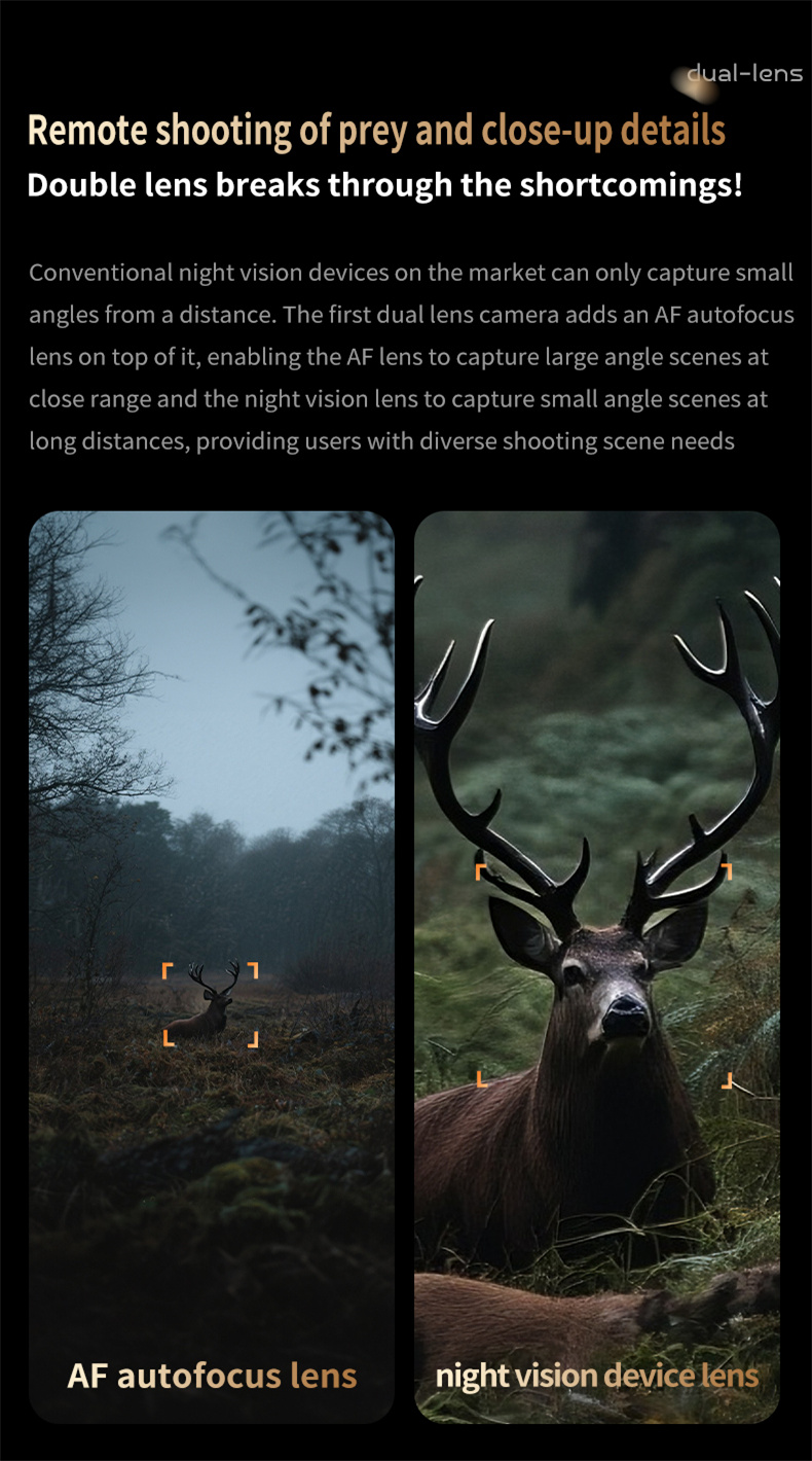 2. Dual Lens System: AF autofocus lens captures close-up details, while the night vision lens is tailored for long-distance shots.