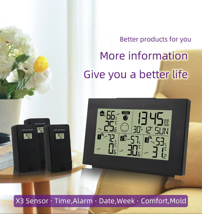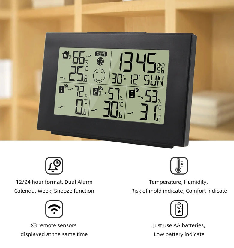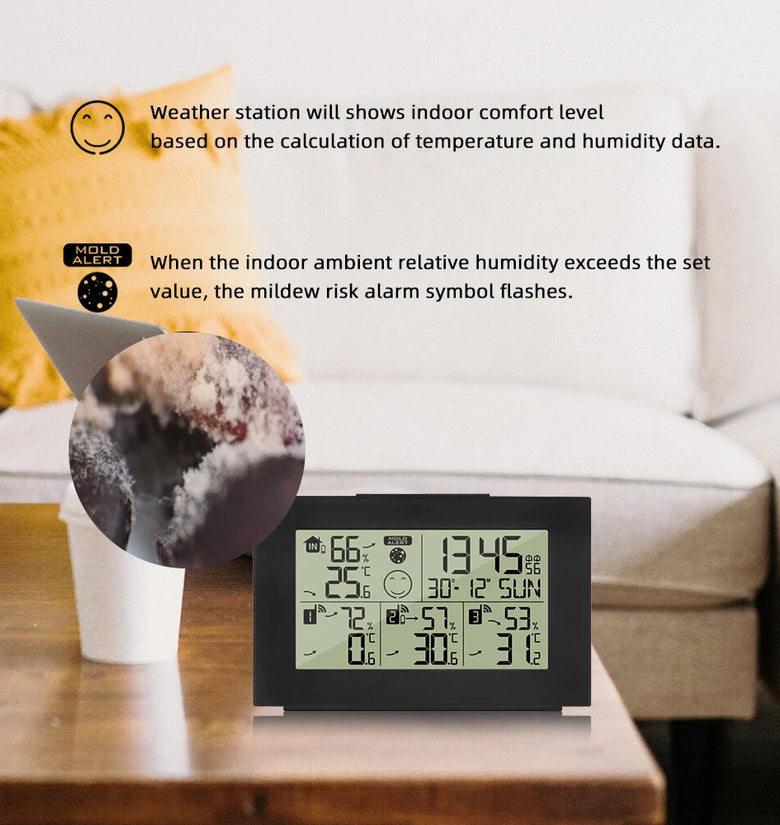 【Function Settings】--Dual Alarm clock,snooze function,low battery indicate,indoor comfort indicate,risk of mold indicate.