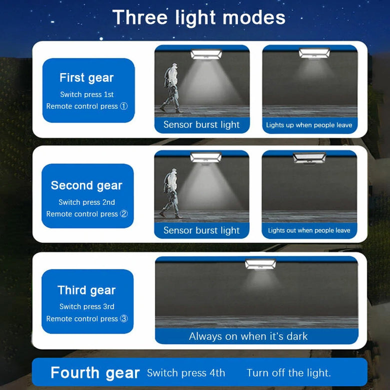 - Click the light button/ key ① on the remote control: At night, no motion, dim light; motion detected, bright light