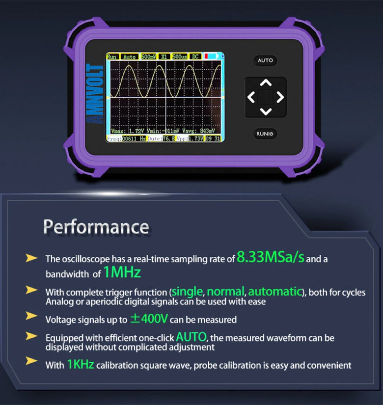 High Sampling Rate: With an 8.33Msa/s sampling rate and 1 MHz bandwidth, this oscilloscope provides precise and accurate measurements.