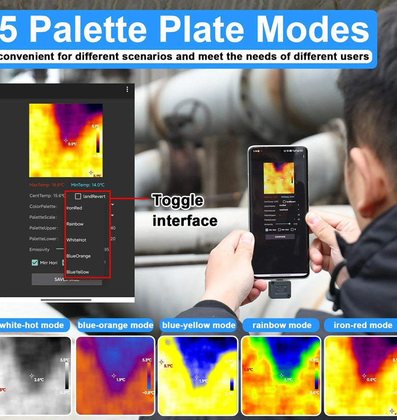 mso-bidi-font-family:'Times New Roman';font-size:10.5000pt;mso-font-kerning:1.0000pt;'>【5 Color Palette Modes】: Offers 5 different color palette modes, including iron-red mode, rainbowmode, white-hot mode, blue-orange mode, and blue-yellow mode, which are convenient for different scenarios and meet the needs of different users.mso-bidi-font-family:'Times New Roman';font-size:10.5000pt;mso-font-kerning:1.0000pt;'>
