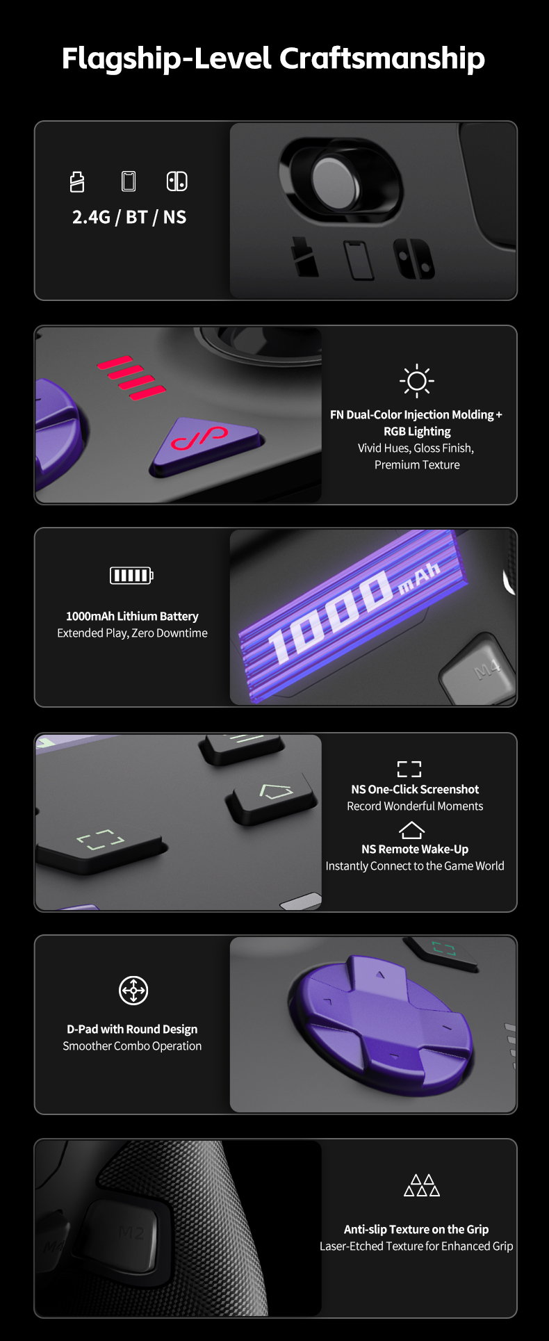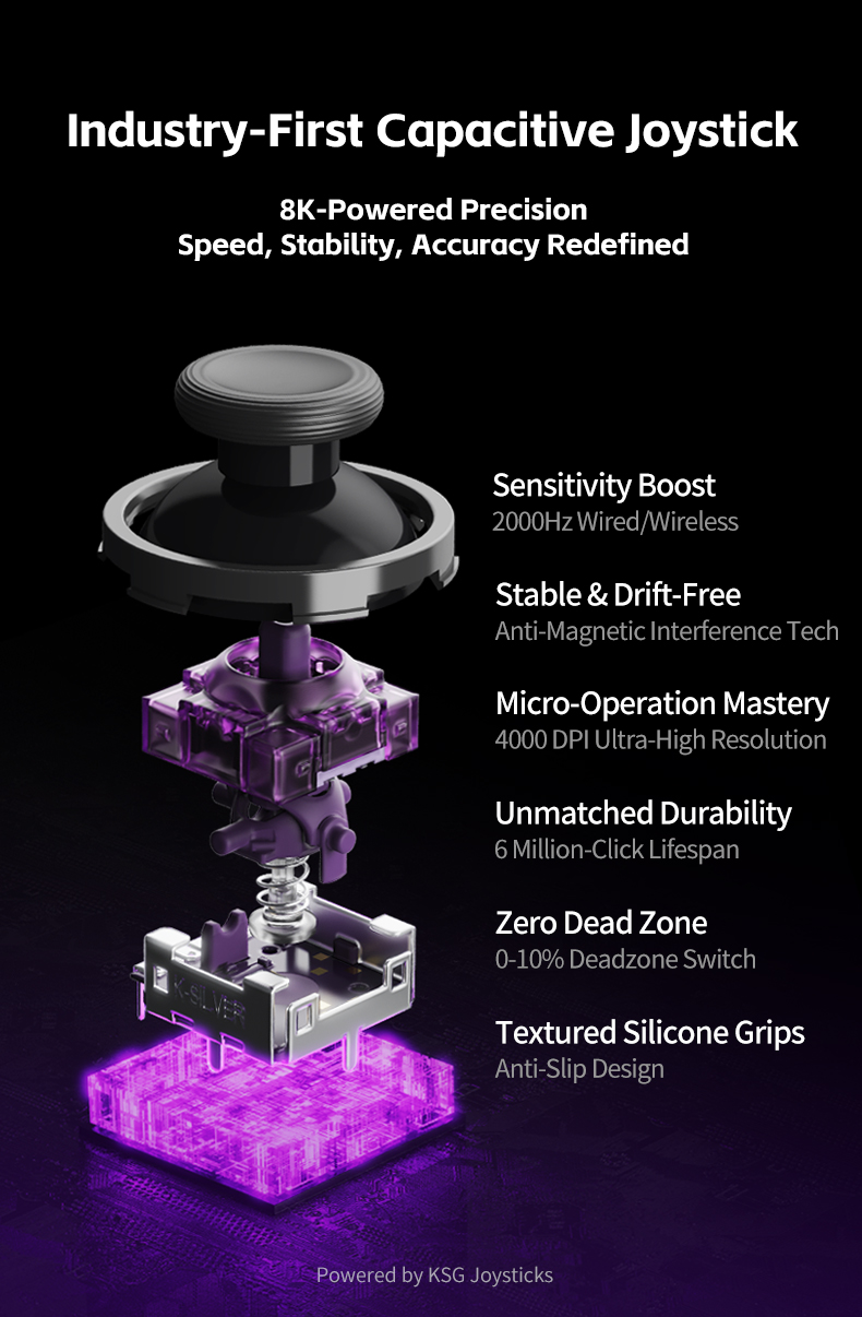 2. Capacitive Joystick: 4000 DPI resolution, zero deadzone, and textured grips for superior control.