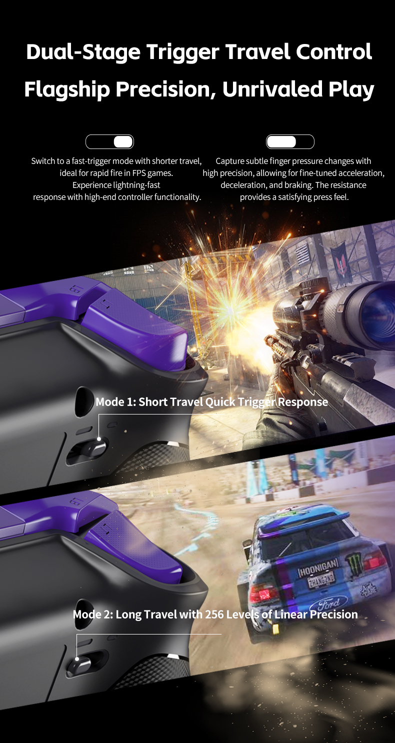 3. Dual-Stage Trigger Design: Short and long travel modes support 256 levels of linear precision and fast responses.