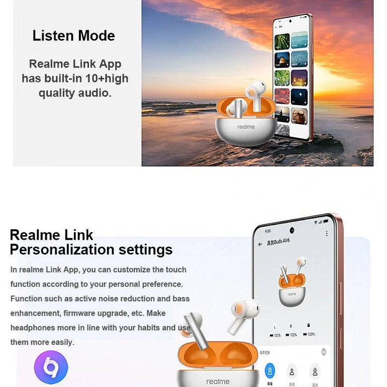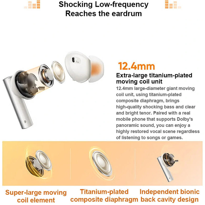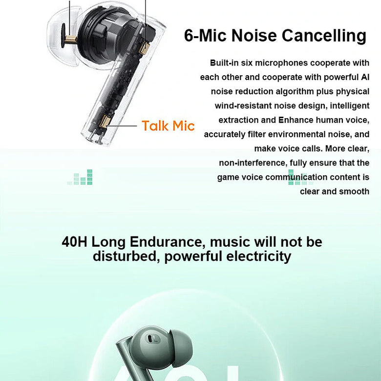 • Realme Buds Air6 TWS bluetooth Earphone ANC Earbuds 50dB Noise Cancelling 6-Mic AI Call Noise Cancelling 12.4mm Moving Coil Hi-Res Audio LHDC 5.0 40H Playback Low Latency In-ear Sports Headphones