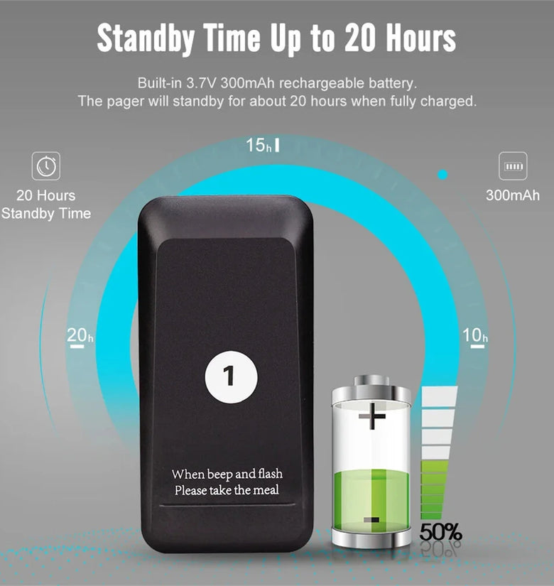 2. Long-lasting Battery: Each pager is equipped with a built-in 3.7V 300mAh rechargeable battery, providing around 20 hours of use on a full charge. This reduces the frequency of recharging, offering convenience and efficiency.