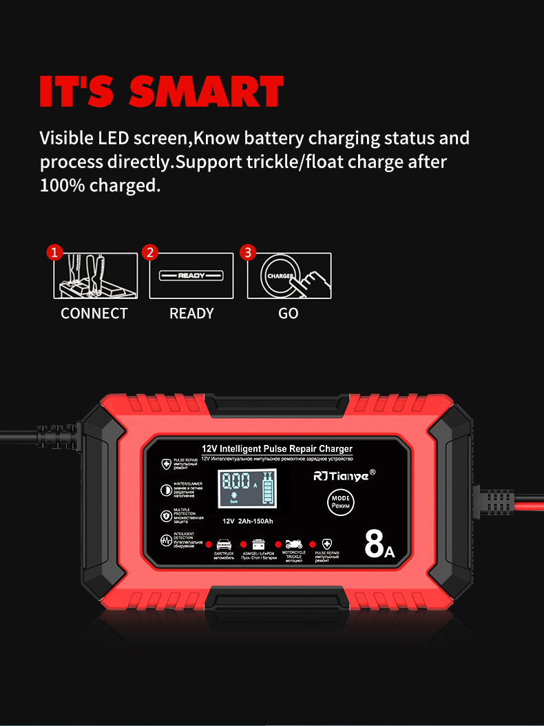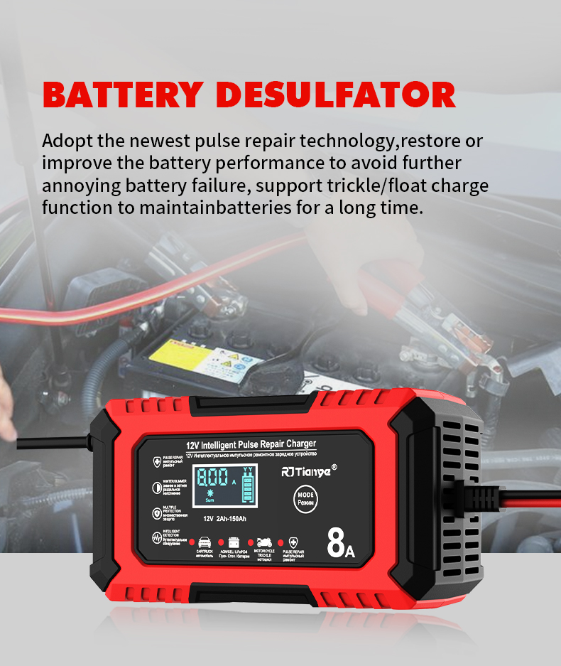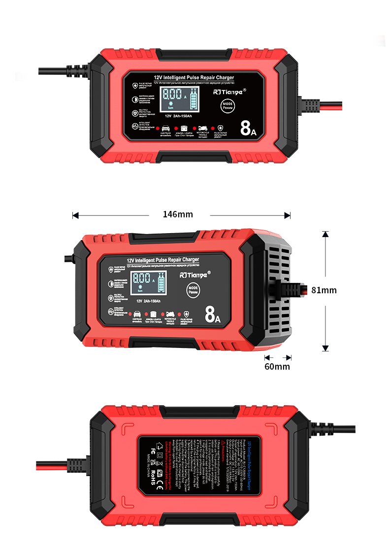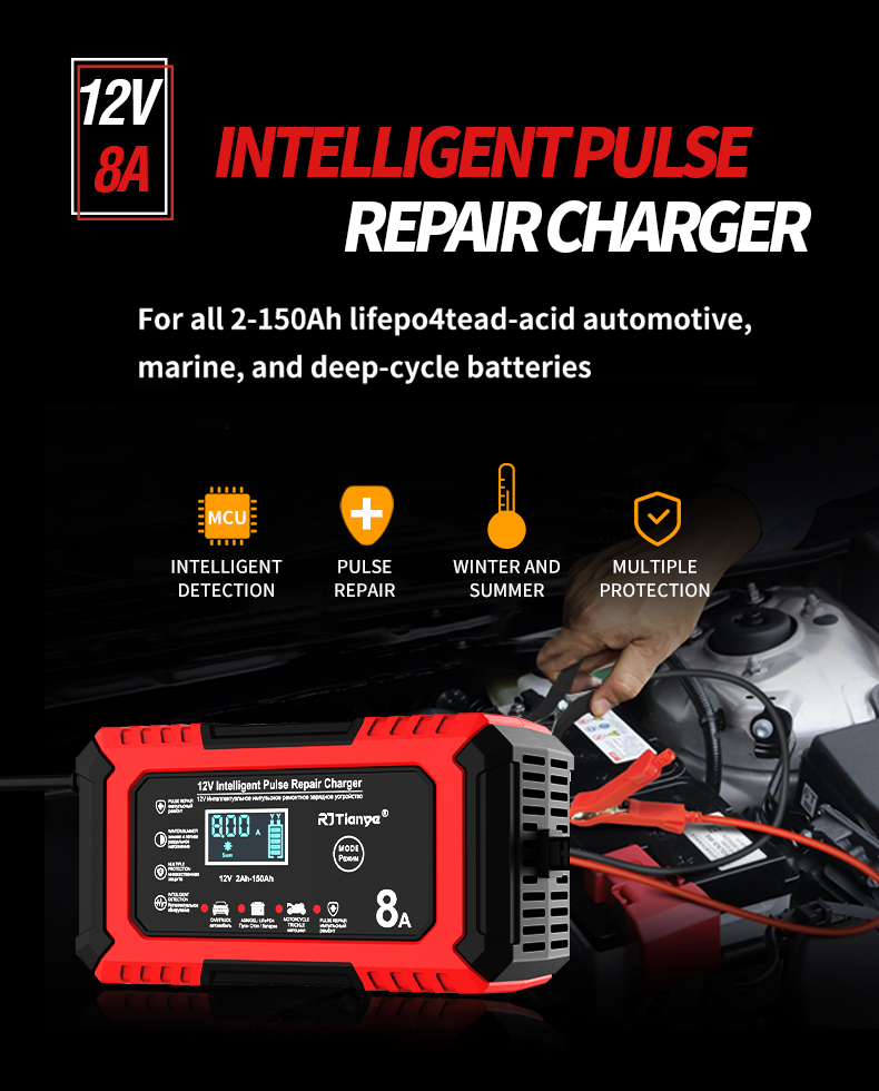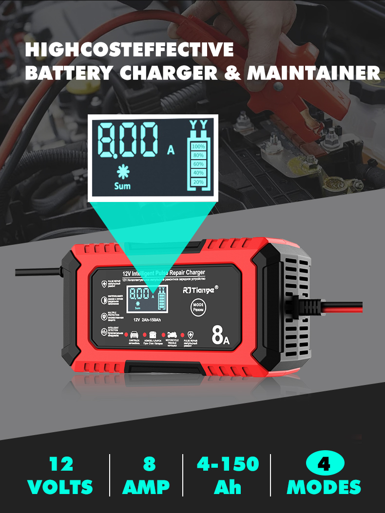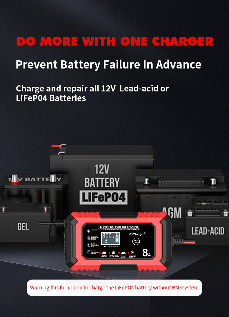• RJTianye 12V 8A 4ah-150ah Intelligent Pulse Repair Charger 110-230V AC Car Motorcycle Battery Charger LiFePO4 Charger Digital LCD Display