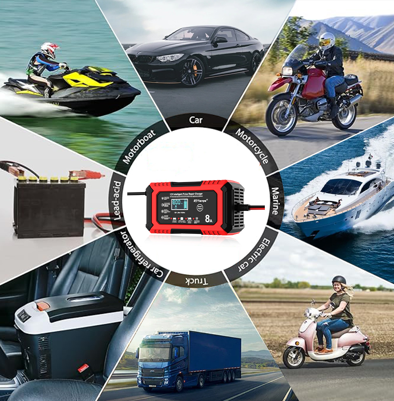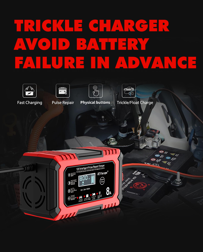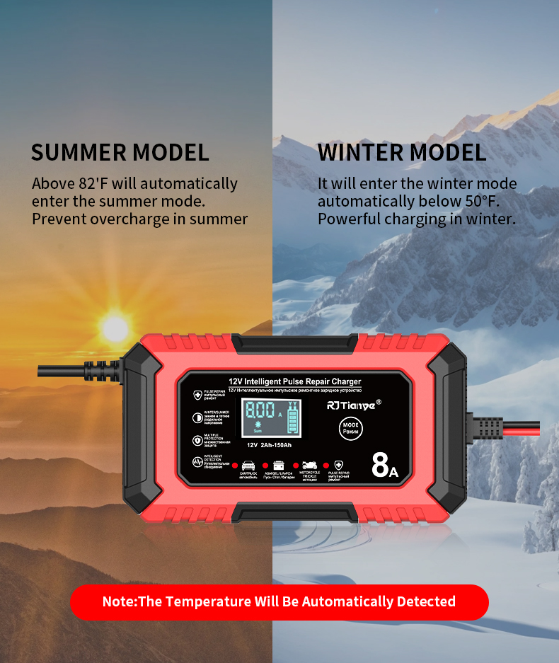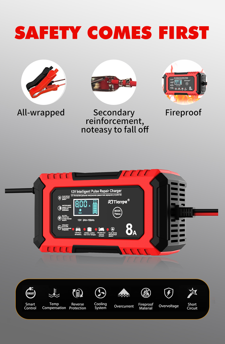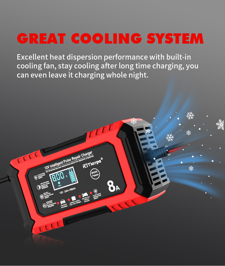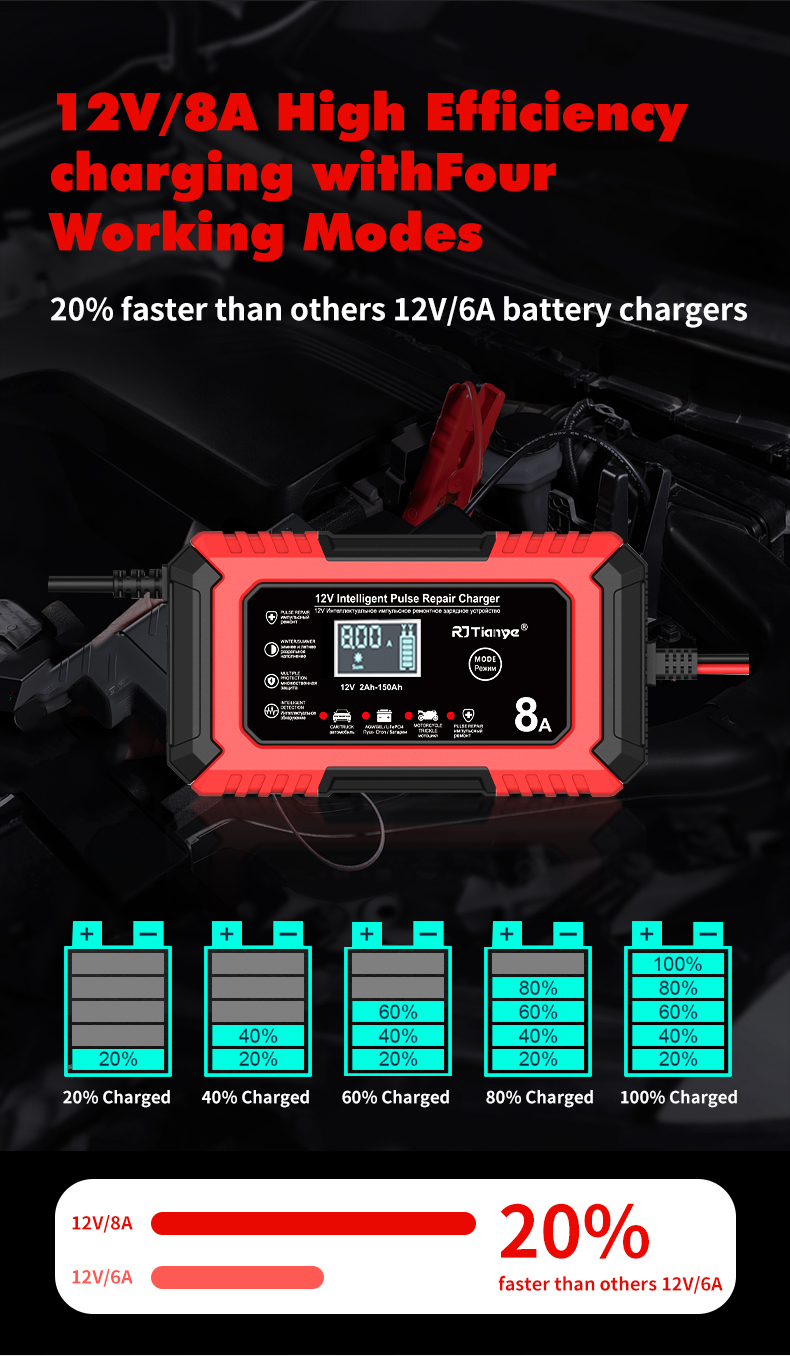 • RJTianye 12V 8A 4ah-150ah Intelligent Pulse Repair Charger 110-230V AC Car Motorcycle Battery Charger LiFePO4 Charger Digital LCD Display