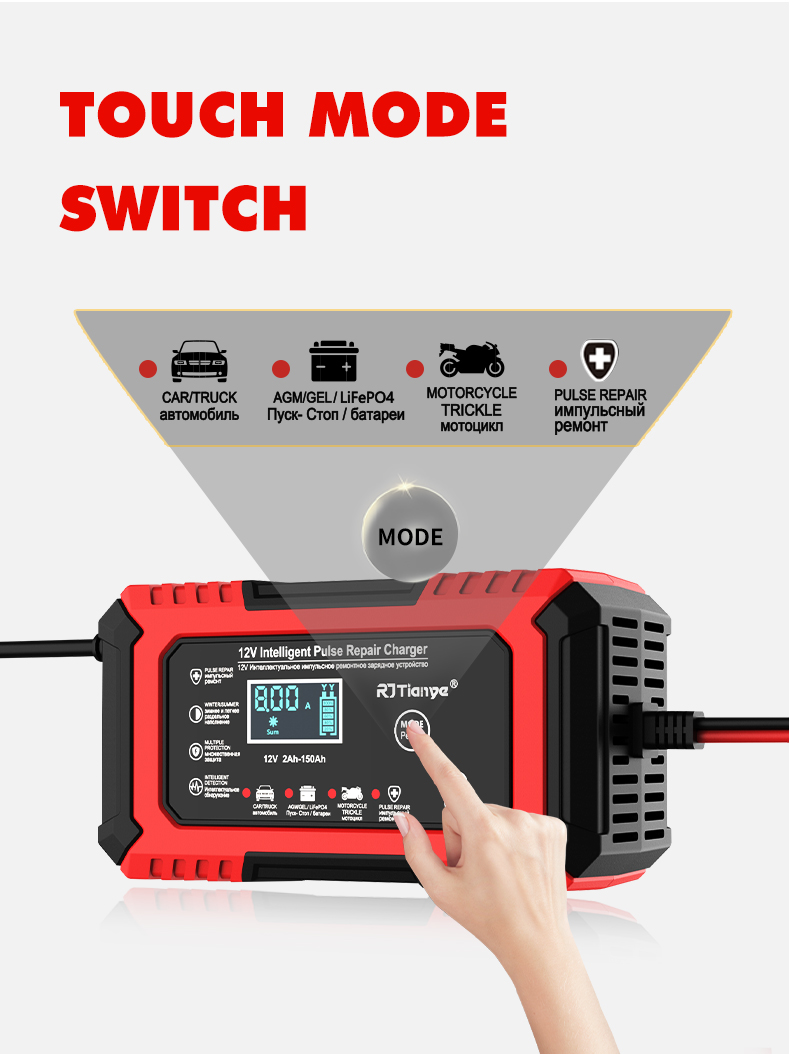- Intelligent Multi-Mode Operation: Features touch mode switch for easy selection among various charging modes such as quick charging, battery repair, motorbike trickle charge, and float charging, ensuring optimal performance.