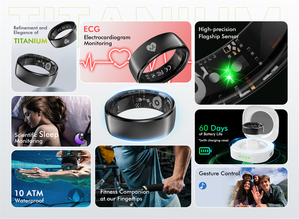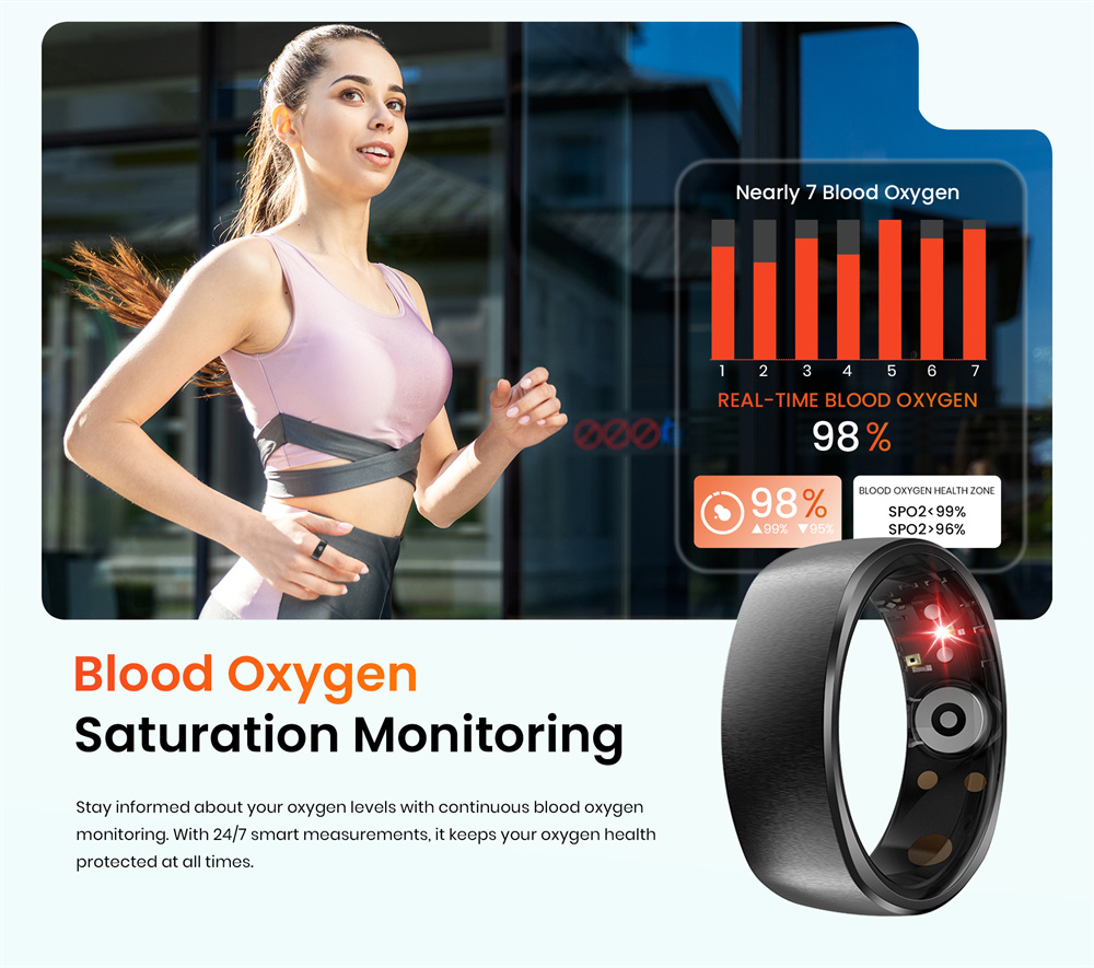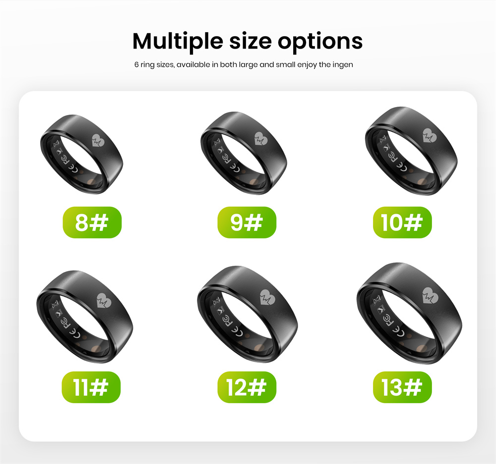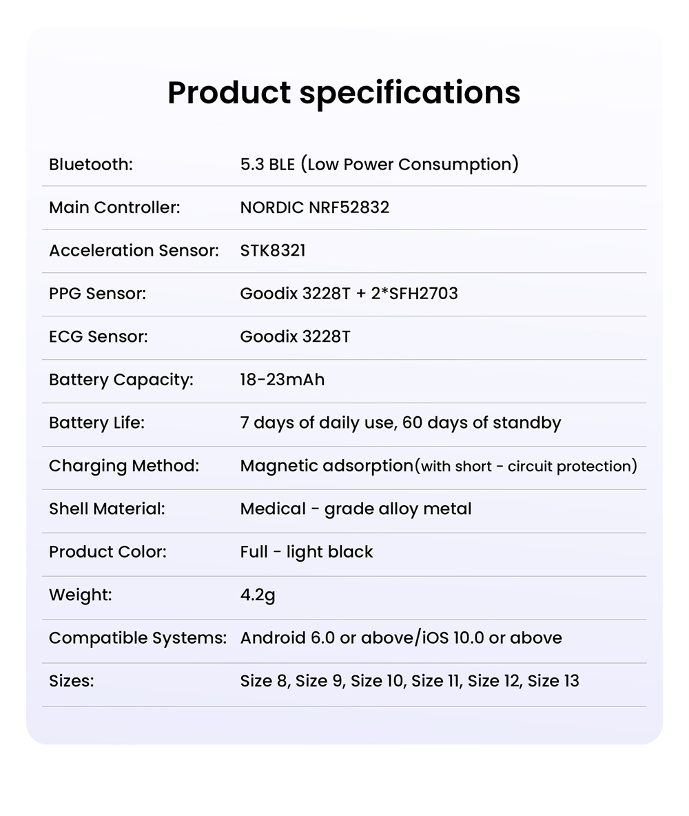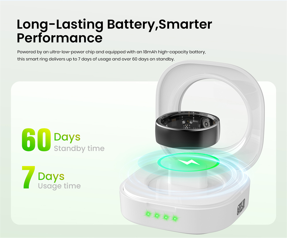 7. Long-lasting Battery Life: Powored by an ultra-low-power chip and equipped with an I8mAh high-copacity battery, this smart ring delivers up to 7 days of usage and over 60 days on standby.