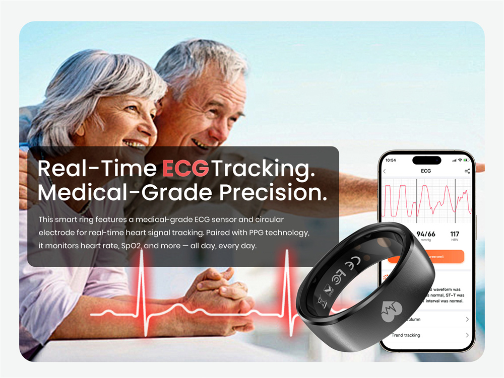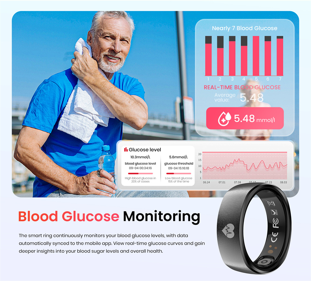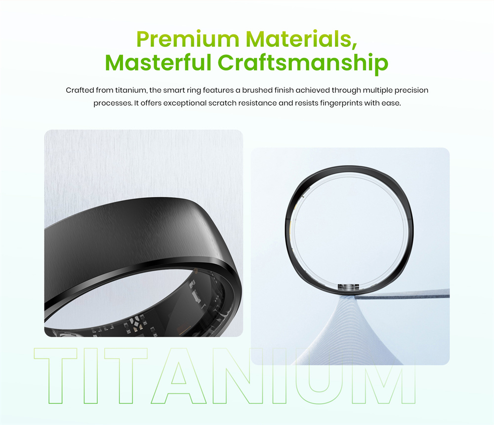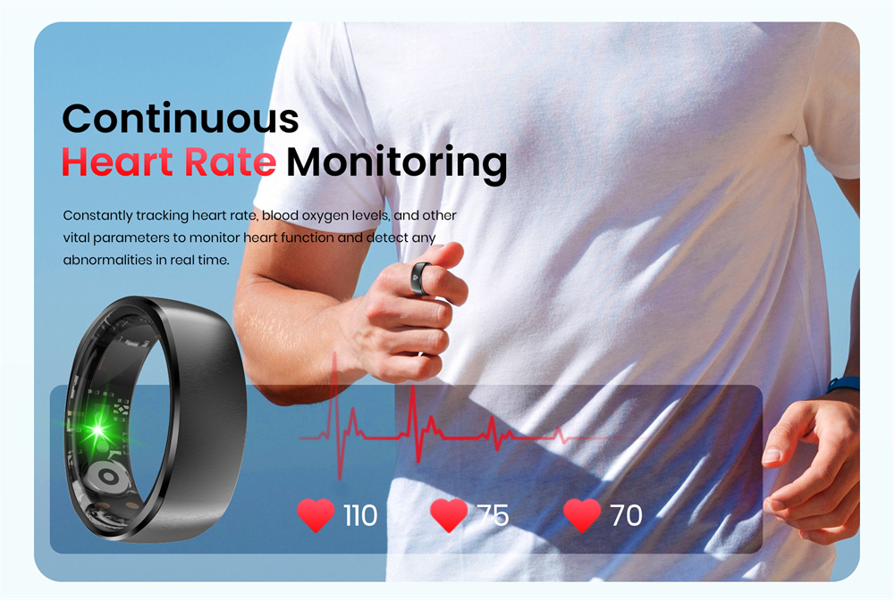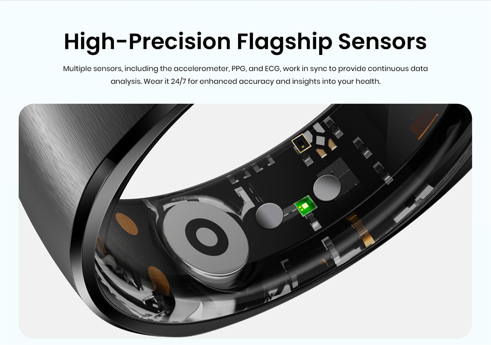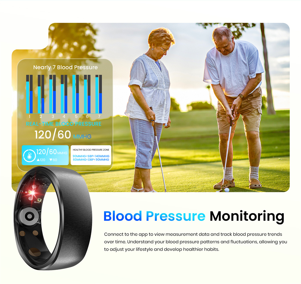 7. Long-lasting Battery Life: Powored by an ultra-low-power chip and equipped with an I8mAh high-copacity battery, this smart ring delivers up to 7 days of usage and over 60 days on standby.