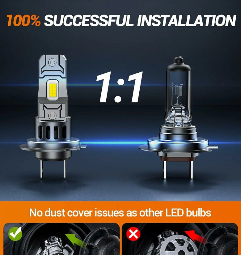 3. Perfect beam pattern: 1:1 mini size like halogen bulb. It can illuminate the road without dazzling other drivers, and can also extend the illumination distance to avoid accidents. Easily travel through suburbs and highways.