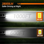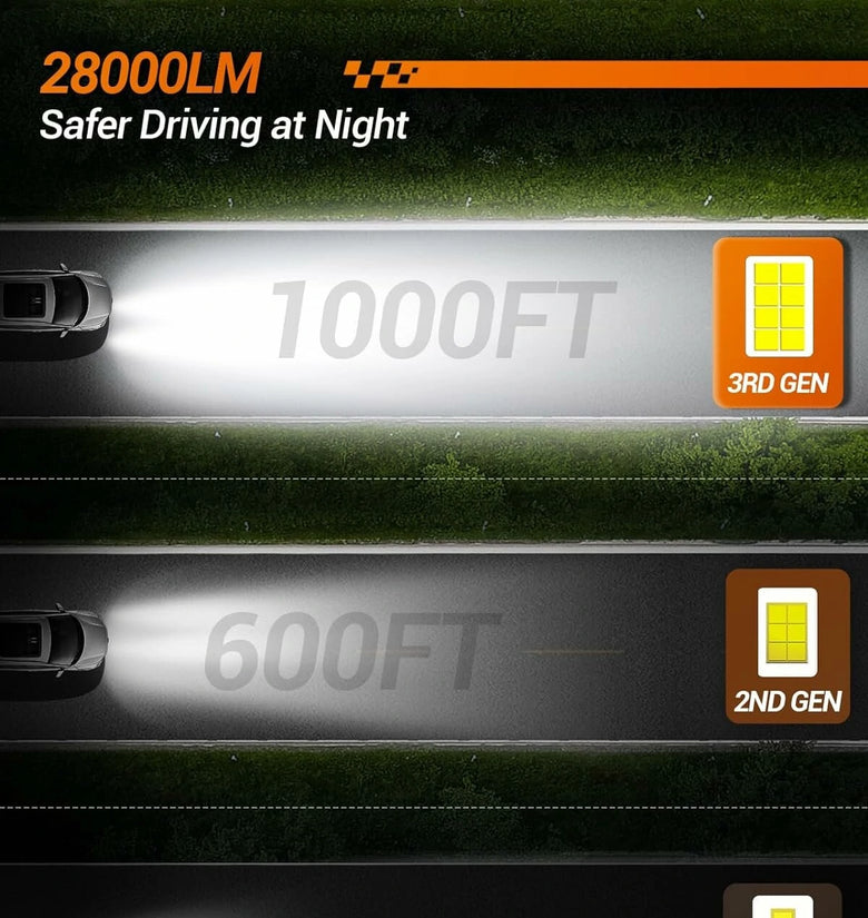 1. Brightness upgrade: Brightness reaches 28,000LM, 700% brighter than halogen bulbs, providing clearer, wider and farther 6500K cold white light brightness, allowing safe driving even on roads with insufficient light such as rural roads.