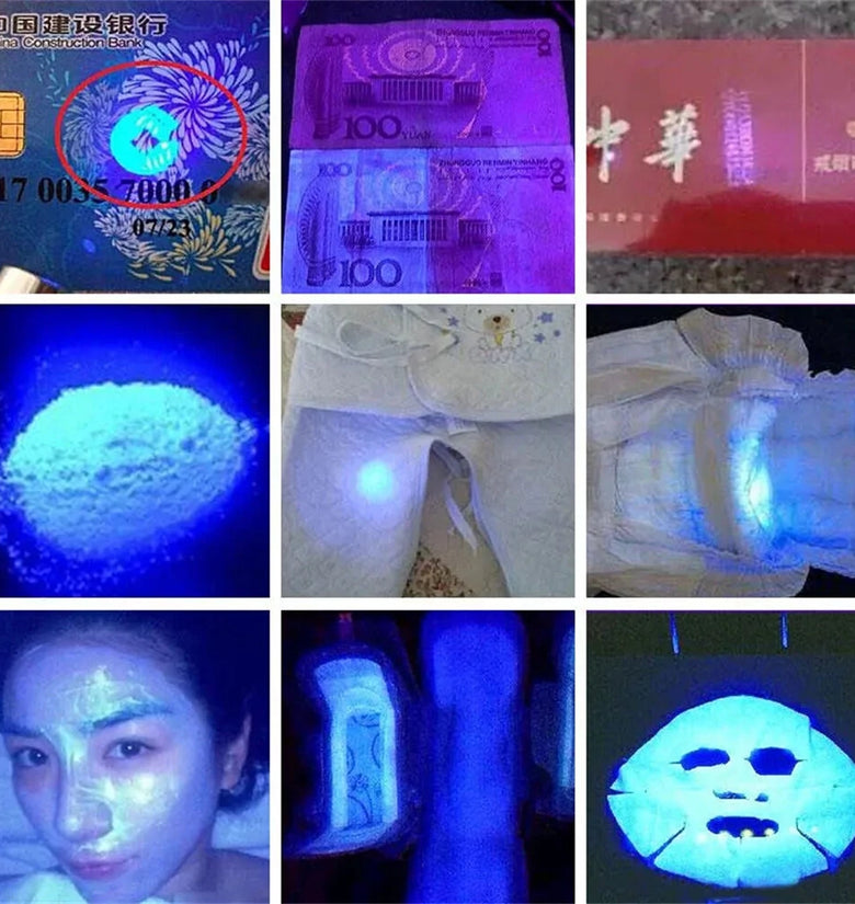 2.UV flashlight is used to detect whether there everyday items containing fluorescent agent, particularly cleaning products, cosmetics, toilet paper, sanitary napkins or diapers, etc.
