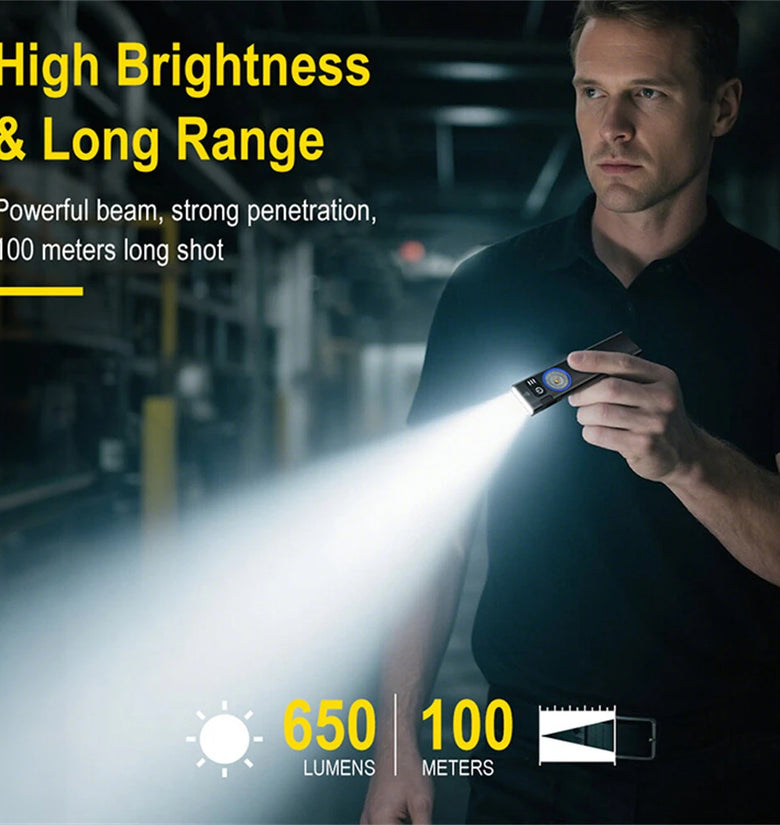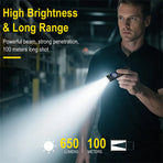 1.Ultra-Bright Main LED with Multiple Modes – Three 351B LEDs deliver up to 650 lumens Turbo (steps down to 200LM for heat protection) plus High (187LM), Medium (73LM) and Low (21LM). Easy one-click ON/OFF, long-press brightness switching, double-click Turbo, triple-click Strobe/SOS, and memory mode for quick access.