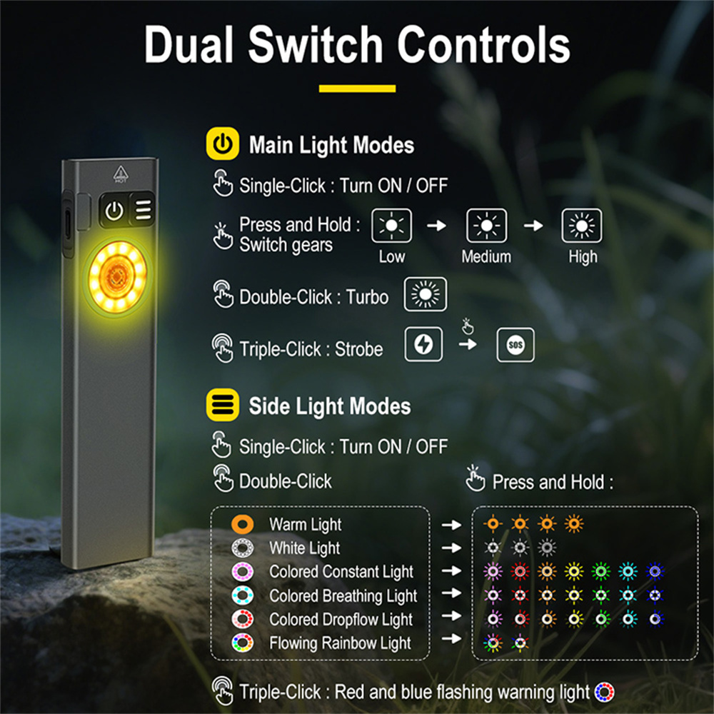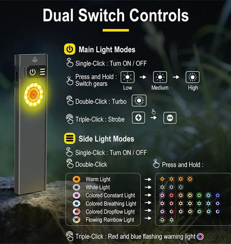 2.Dual Side Light with RGB & Warm Yellow – Integrated 351B yellow LED + 0807 RGB LEDs offer versatile lighting: warm yellow beam, RGB mixed white, color constant, breathing, guiding and flowing modes, plus red/blue police flash. Long-press color cycles let you fine-tune brightness and color combinations.