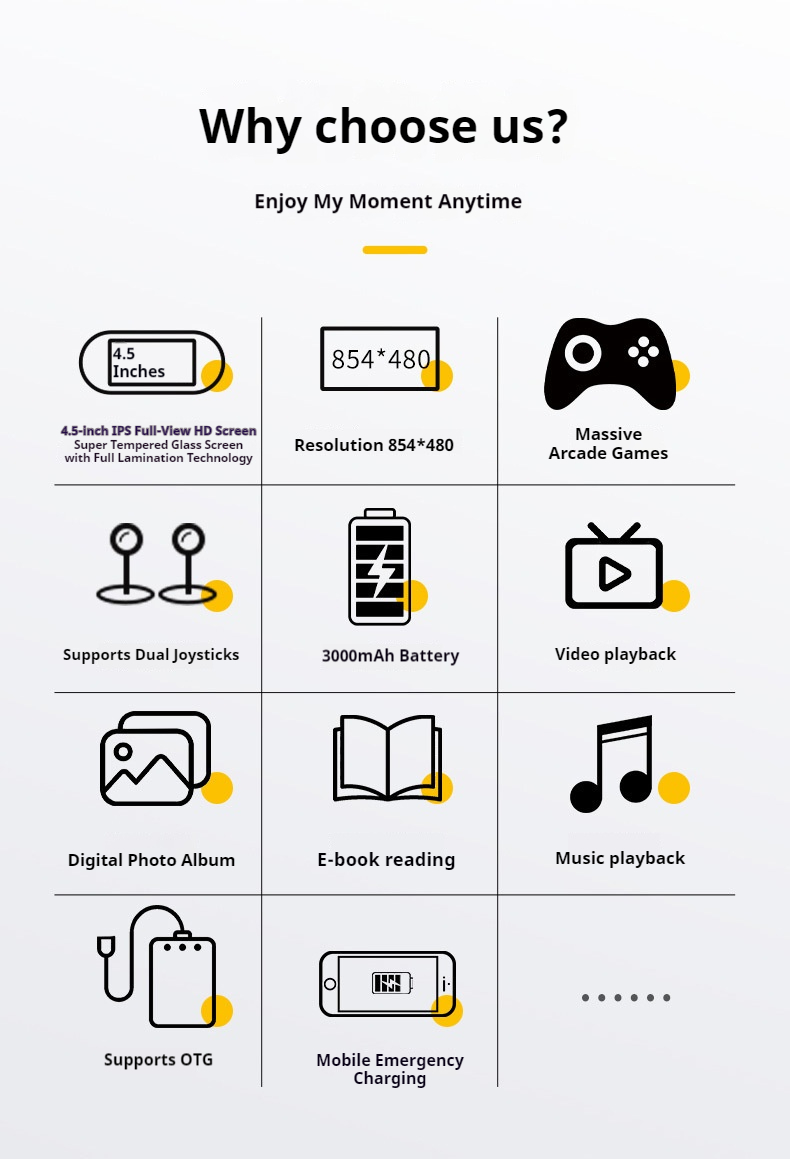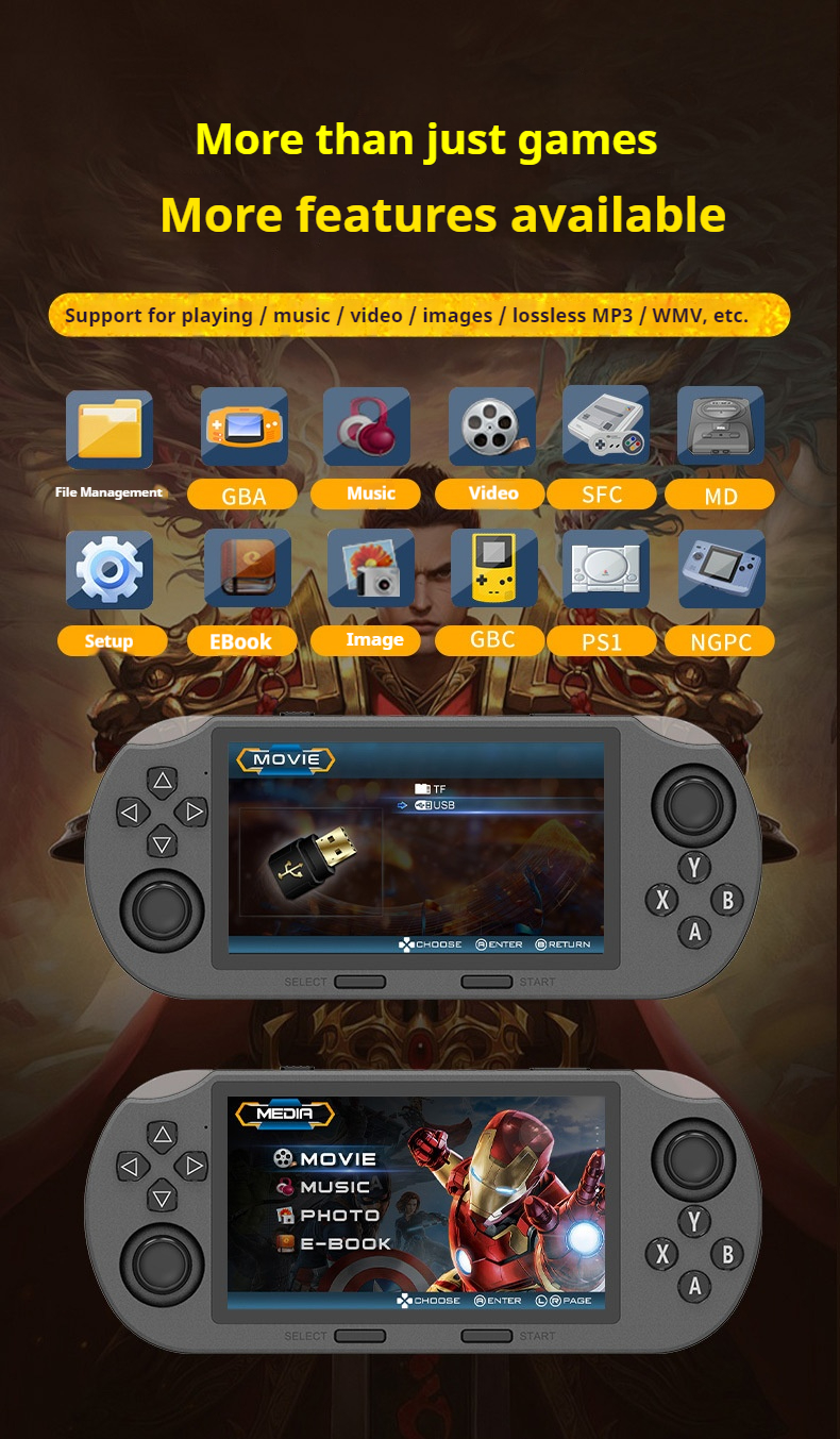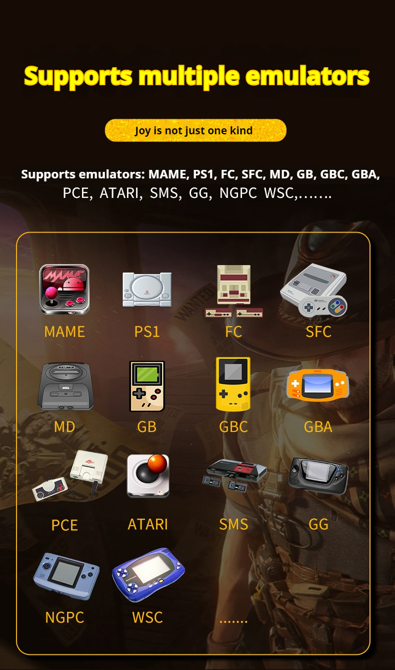 1. Multi-Format Emulator Support: Compatible with MAME, PS1, FC, SFC, MD, GB, GBC, GBA, PCE, ATARI, SMS, for GG, NGPC, and WSC systems.
