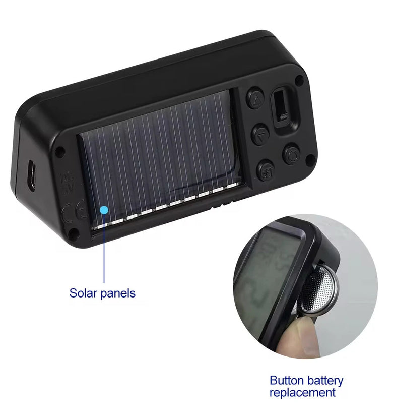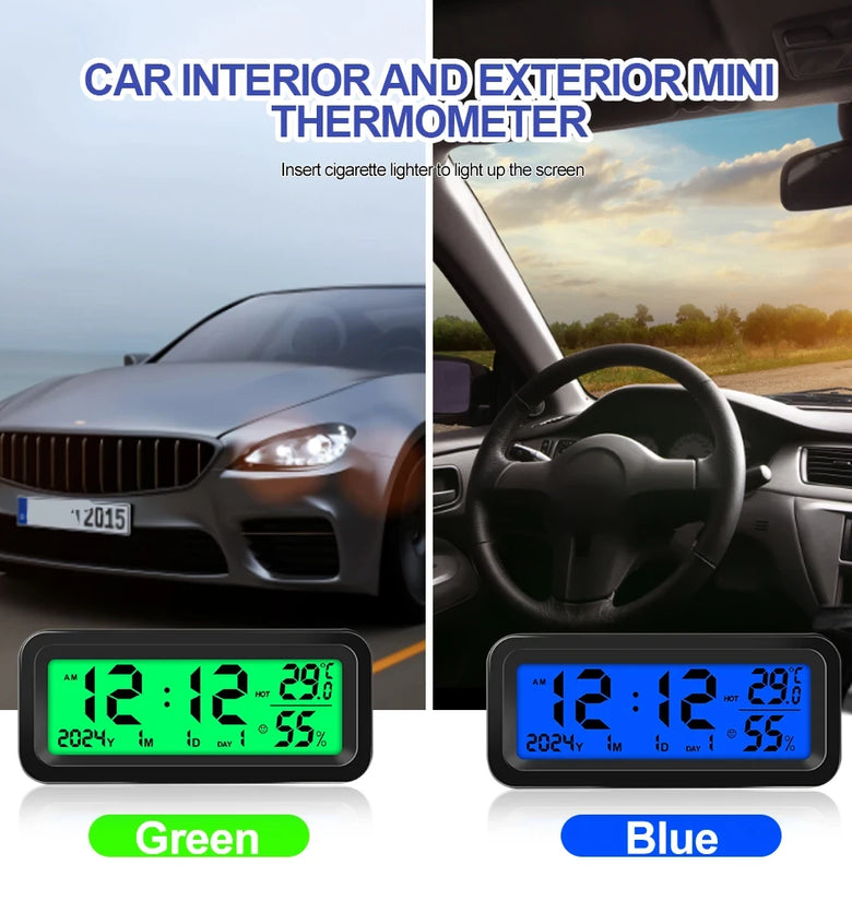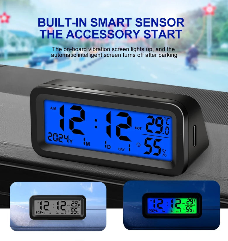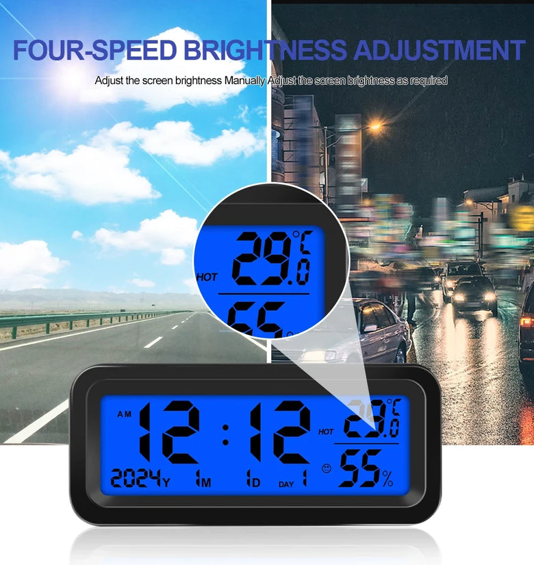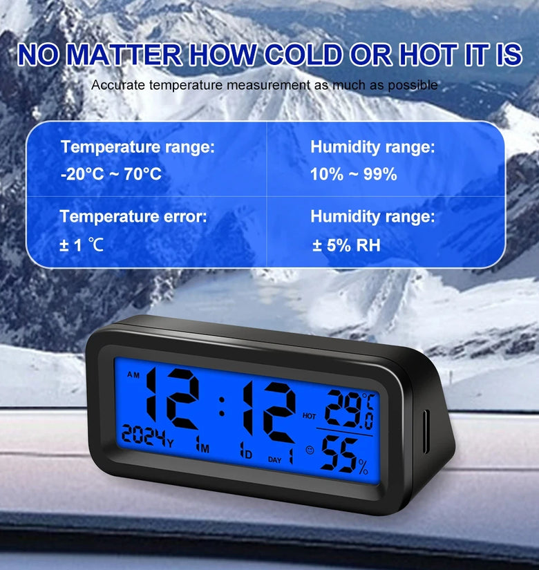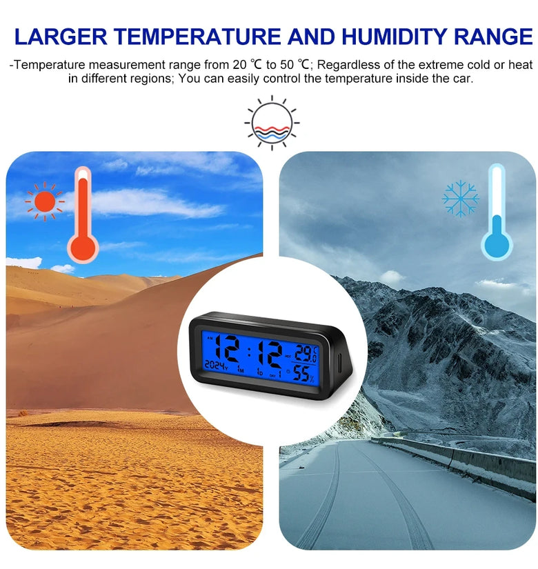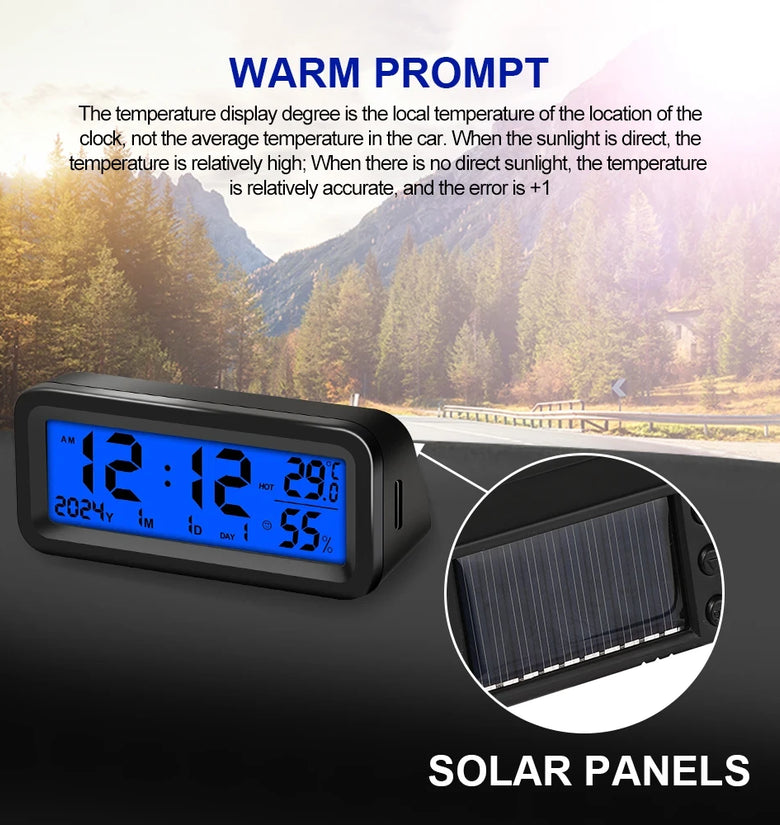 • Solar Car Digital Clock Date Week Temperature Humidity LCD Backlit Display for Dashboard Car Clock Automobiles Internal Stick-On