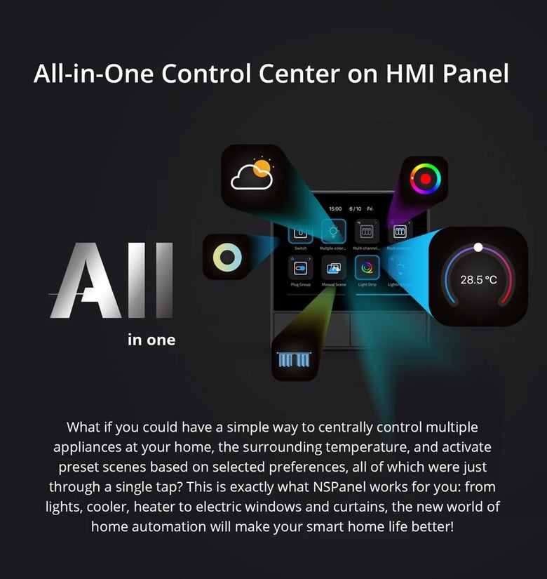 【All in One Control Center】 NSPanel can help you achieve the use of specific scene modes in different scenes with one tap. In addition to the scenario-based control, it is compatible with almost all sonoff devices and the central control function of the control group.