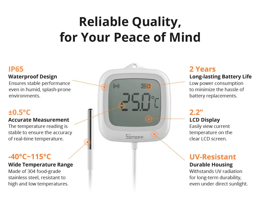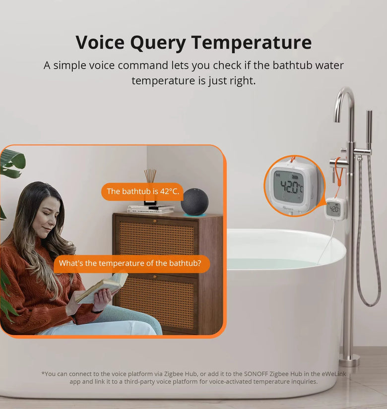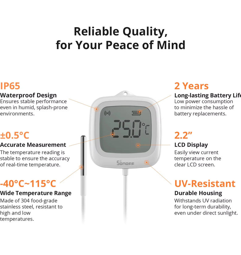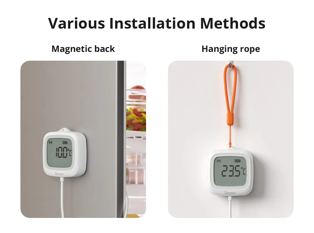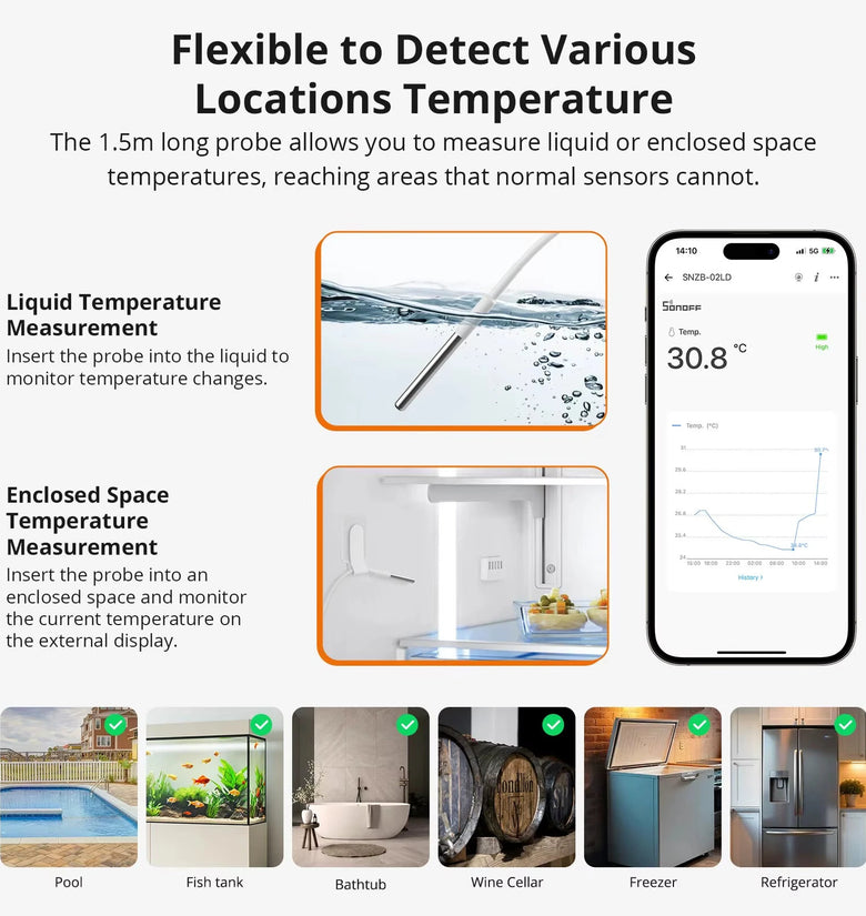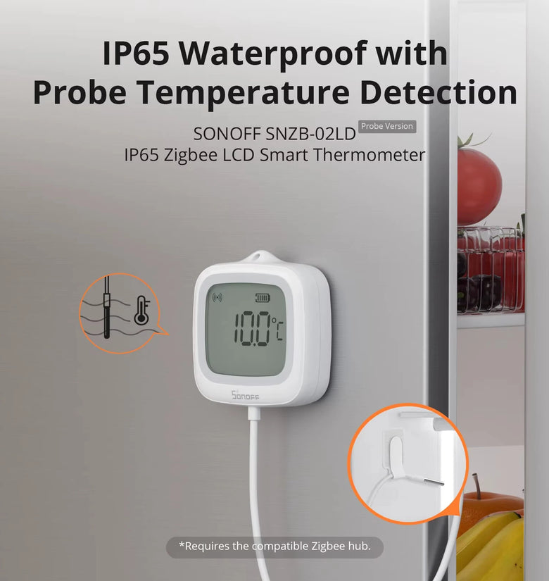• SONOFF SNZB-02LD Zigbee3.0 LCD Smart Thermometer with Probe IP65 Waterproof for Fridge Pool Fish Tank Wine Cellar via ZBBridge-P