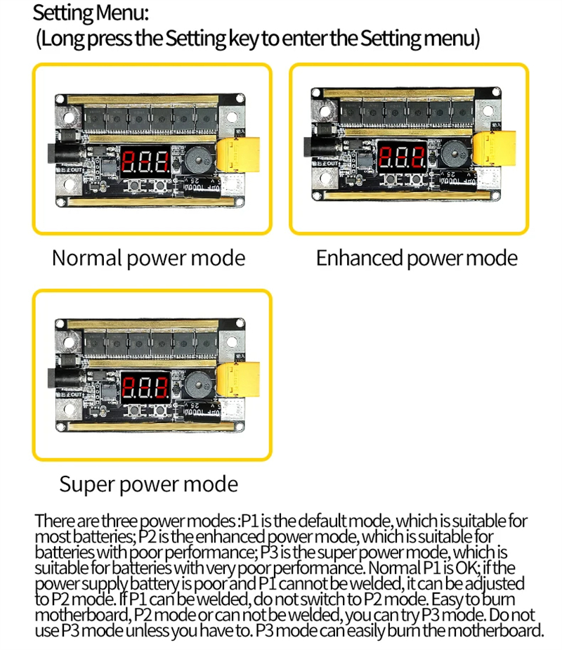 2) Versatile Working Modes: Offers three power modes – general, strengthened, and super-strong – to fit various welding needs and applications.
