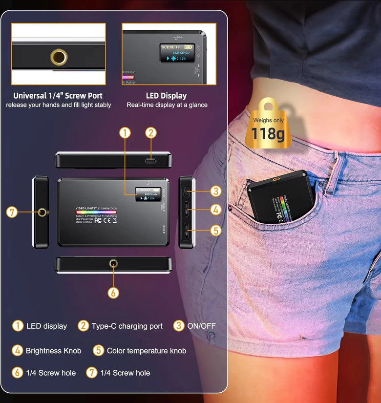 Model: ST120RGBCharging port: Type-COperating voltage: 3.7VBattery type: 3000mAh polymer lithium batteryNumber of lamp beads: 120 high-brightness LEDsColor rendering value: >95Lighting angle: 120°Color temperature: 2500K-9000KDimensions: 106 x 16 x 6Weight: 118g