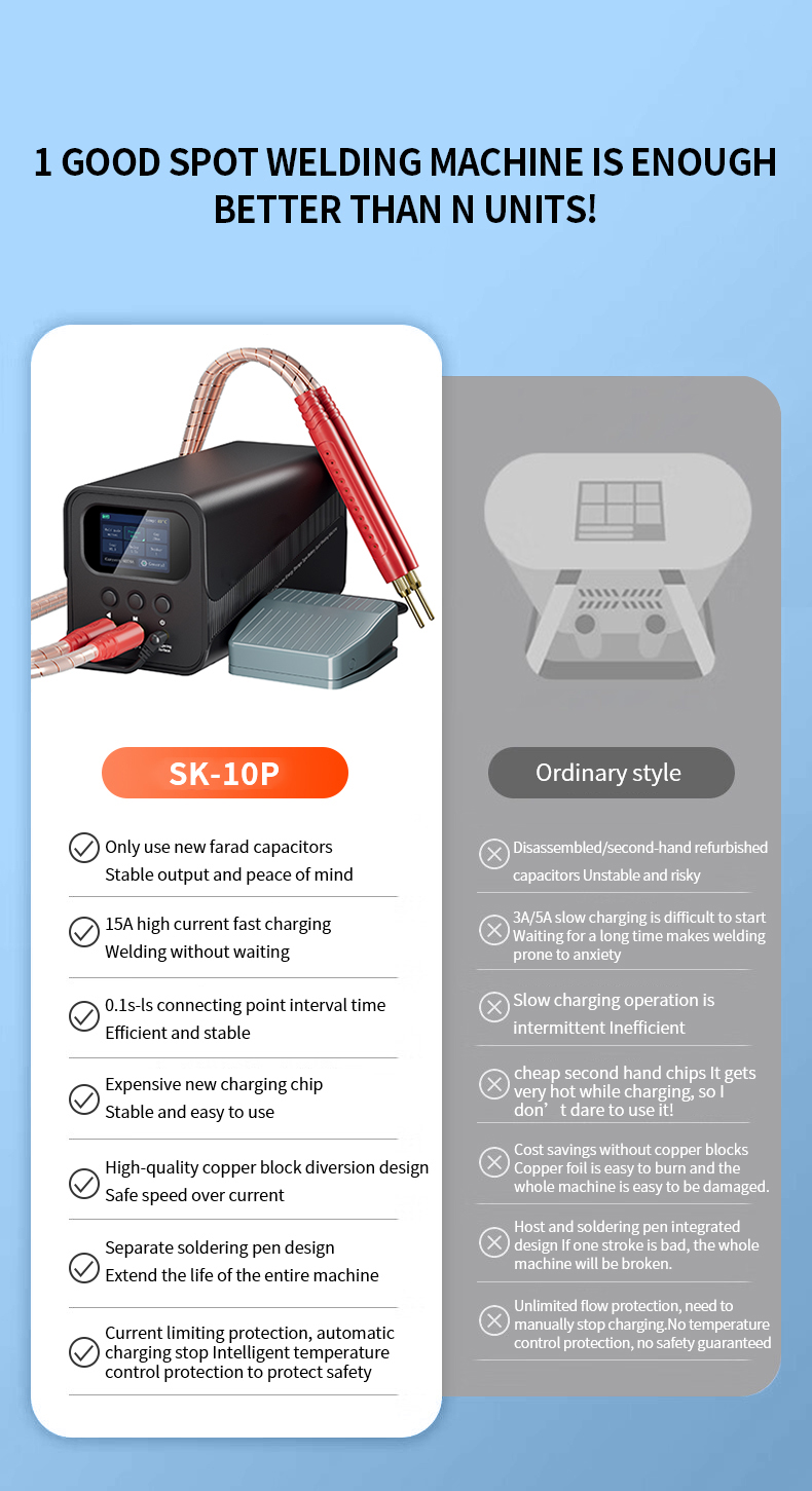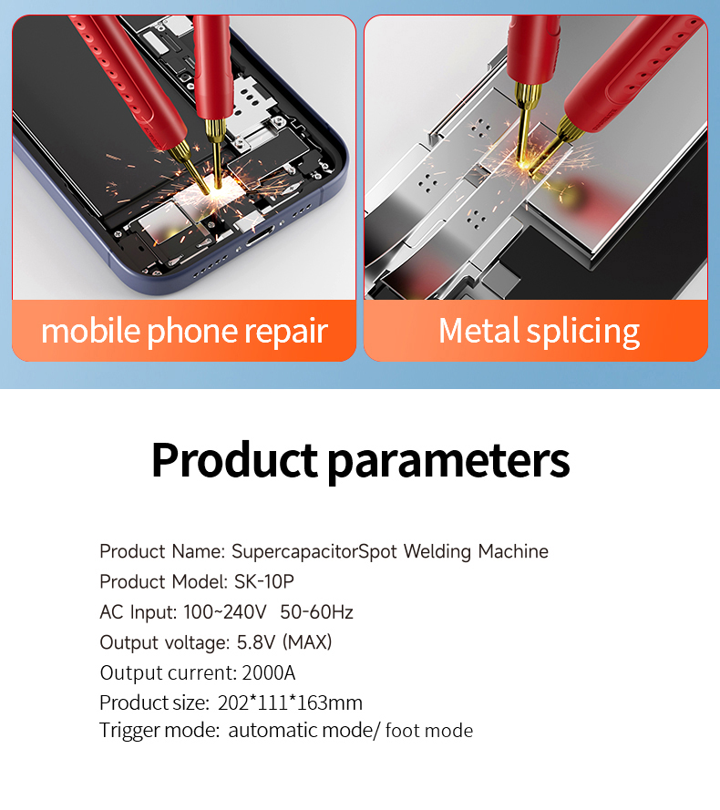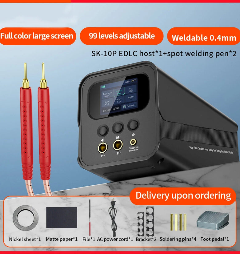 • Supercapacitor Spot Welding Machine SK-10P 2000A Output 5.8V Automatic and Foot Mode for Battery Repair and Metal Splicing Compact Design Adjustable Levels