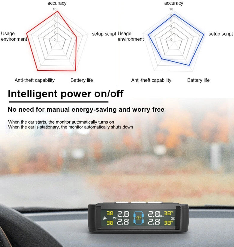 - Real-Time Pressure and Temperature Monitoring: Capable of simultaneously monitoring the pressure and temperature of all four tires, displaying the data on a clear and centralized screen. This ensures you are always aware of the condition of your tires, enhancing safety and performance.