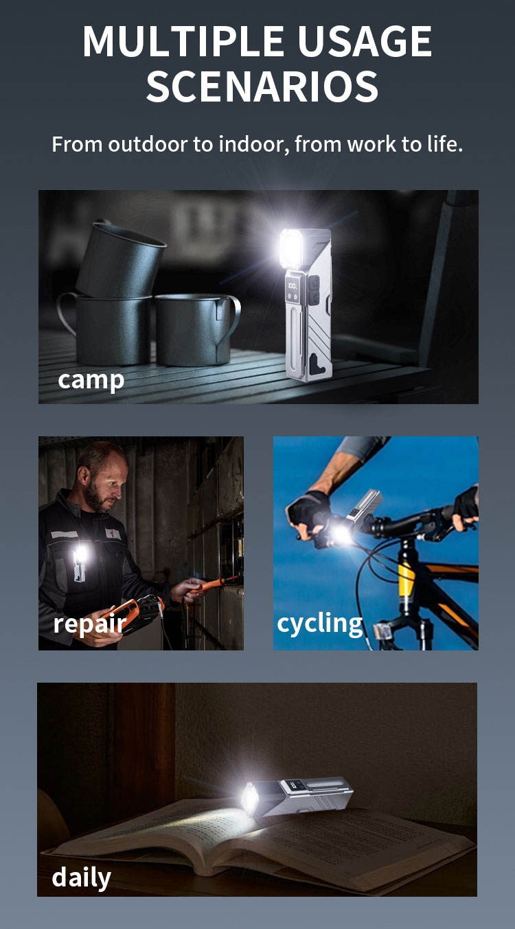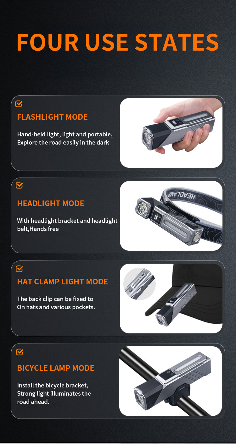 1. Multi-functional use: Flashlight, headlight, hat clamp light, and bicycle lamp modes provide versatility for different scenarios.