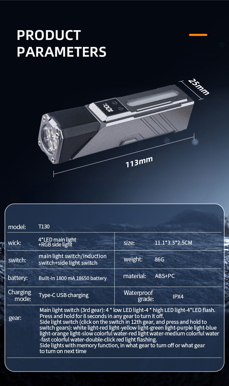 Side light switch(click on the switch in 12th gear and press and hold to switch gears): white light-red light-yellow light-green light-purple light-blue light-orange light-slow colorful water-red light water-medium colorful water-fast colorful water-double-click red light flashing.