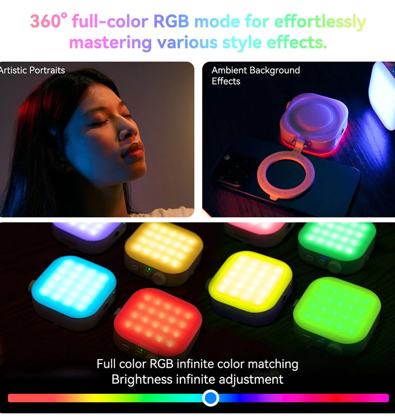 1. 360° Full-Color RGB Mode: With infinite color matching and brightness adjustment, this light provides various color effects for artistic portraits