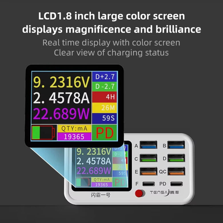 2. LCD Digital Display: 1.8-inch color screen provides real-time information on voltage, current, power, and charging status for all connected devices.