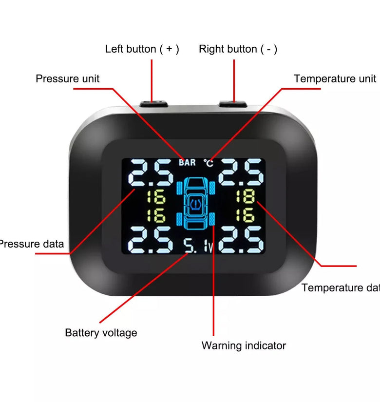 - Dual Display Metrics: The device displays both tire pressure and temperature simultaneously, giving you comprehensive real-time data. The selectable temperature units (°C or °F) enhance user convenience and adaptability to different preferences.
