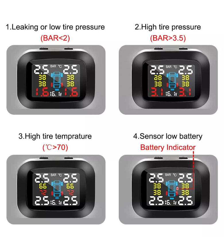 - Comprehensive Alerts: Equipped with visual and audio alerts, the system notifies you immediately of any critical changes in tire pressure or temperature. Customized high/low-pressure and high temperature alarms provide comprehensive monitoring, ensuring a safer driving experience.