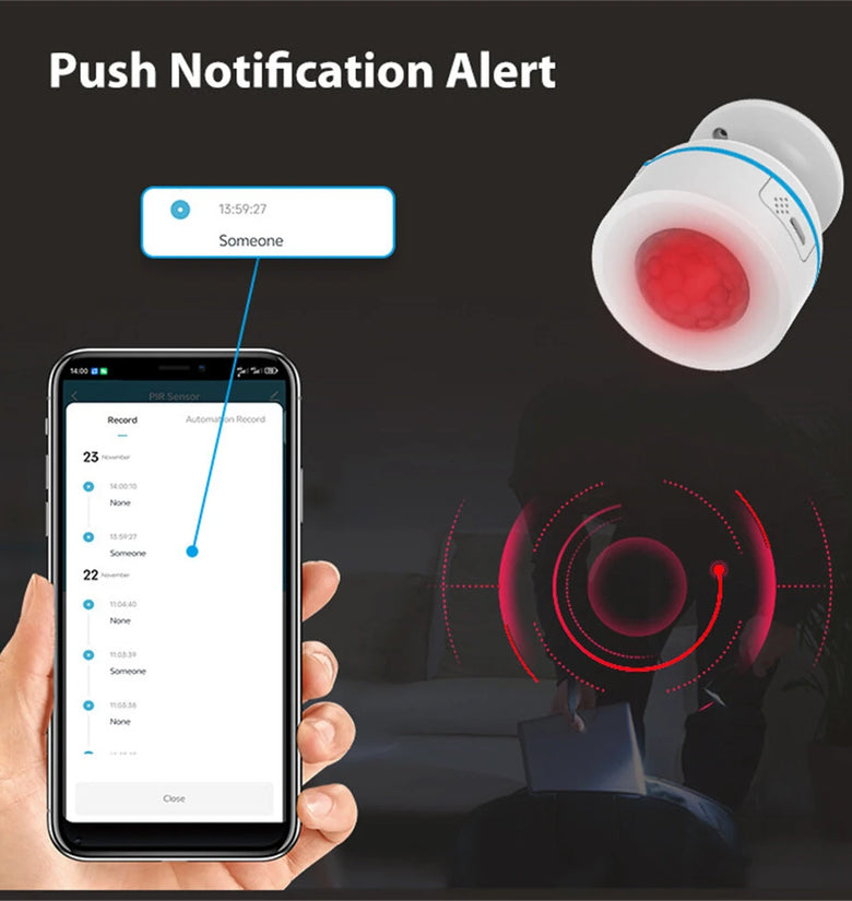 - Smart phone will get instant notifications when PIR triggered and check the log on APP.