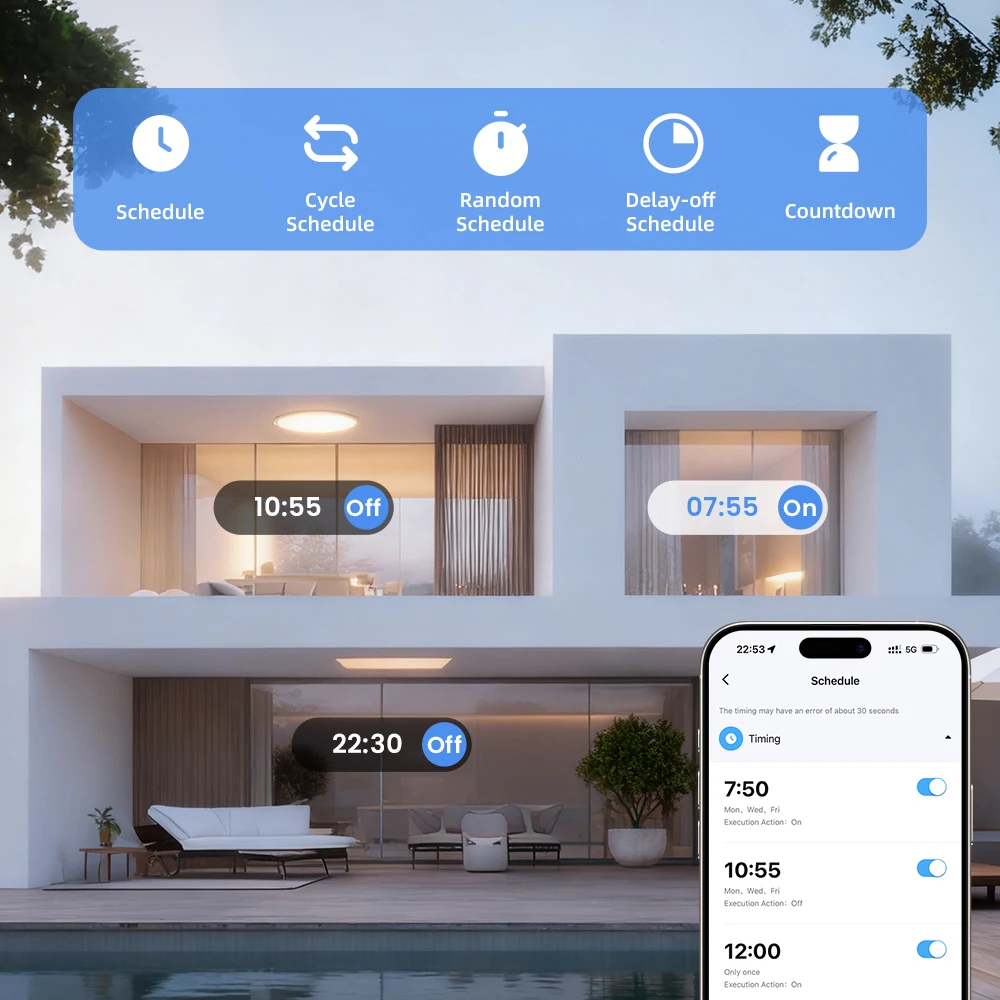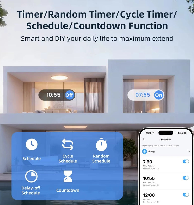 1. Flexible Scheduling: Supports delay-off, cycle, random, and countdown scheduling for efficient device control.