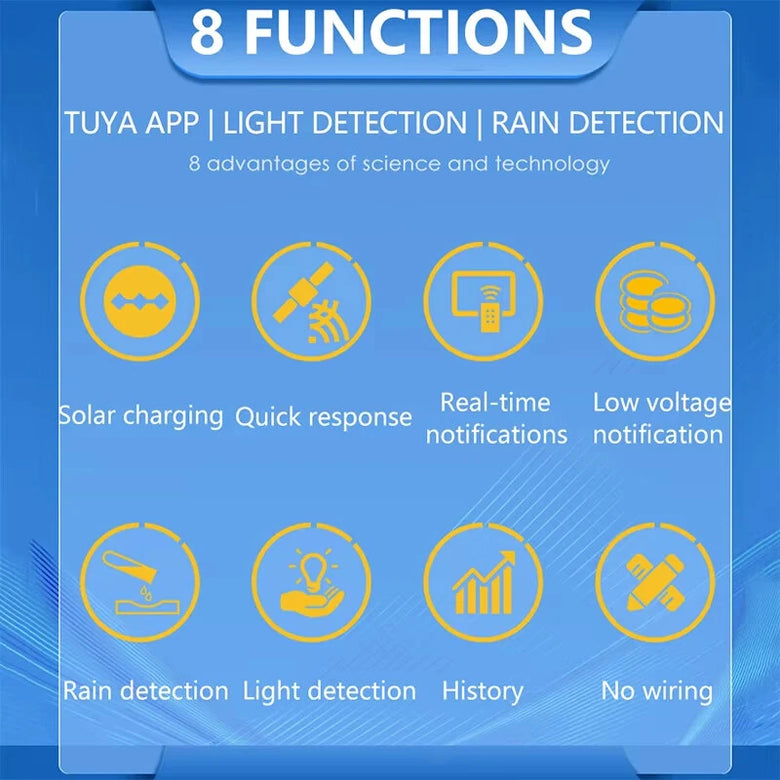 1. Smart Life APP Control: Monitor weather conditions, battery level, rain detection status, and light intensity in real-time via 'Tuya' and 'Smart Life' apps.