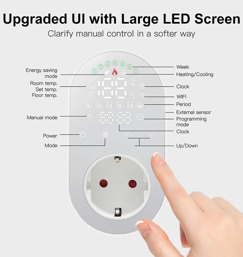 • Tuya WiFi 16A Digital Thermostat Outlet EU Plug Touch Screen Timing Dual Temperature Controller Wireless APP Monitoring Voice Control Work with Alexa Google Home